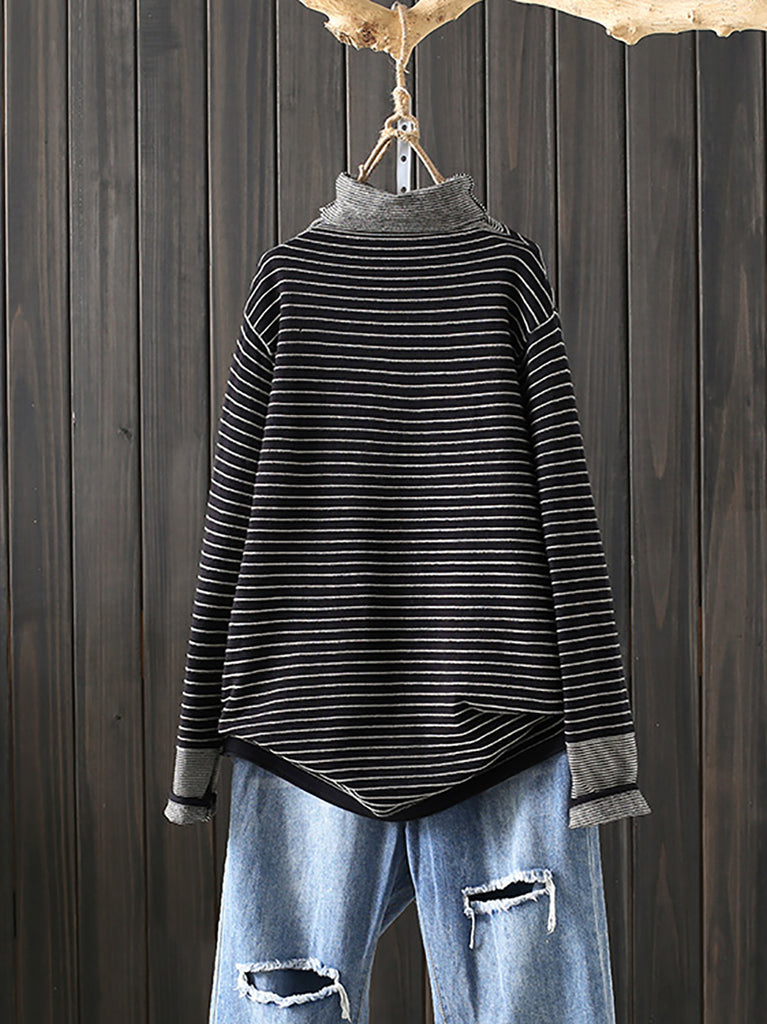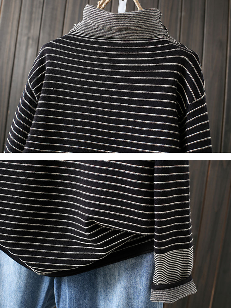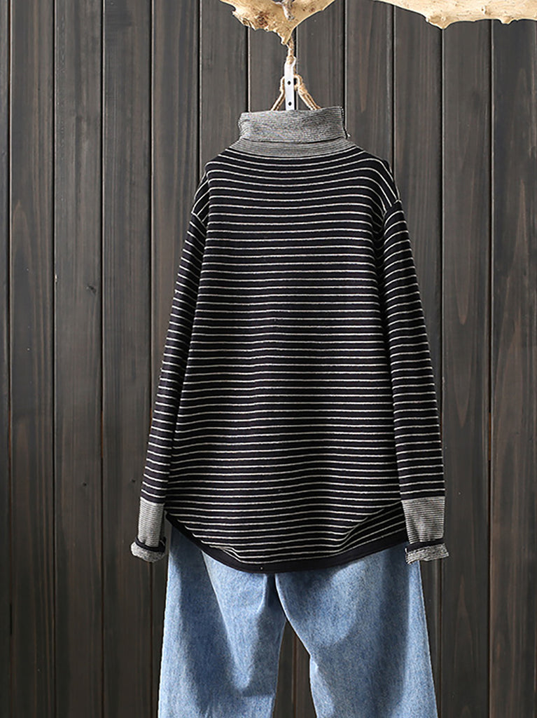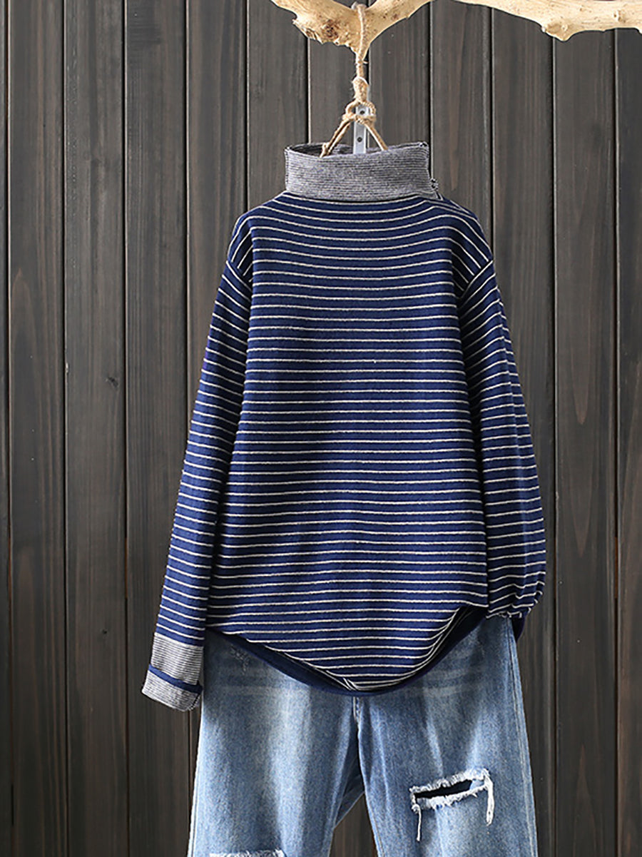 Women Autumn Casual Colorblock Stripe Turtleneck Blouse