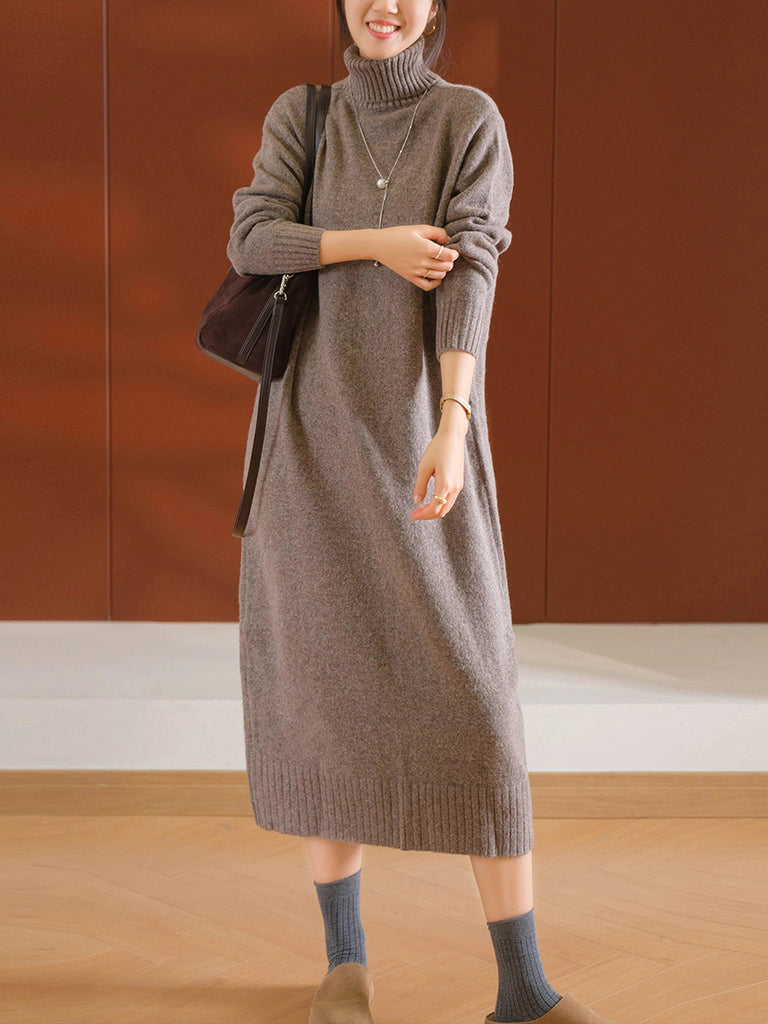 Women Autumn Vintage Pure Color Turtleneck Knitted Dress