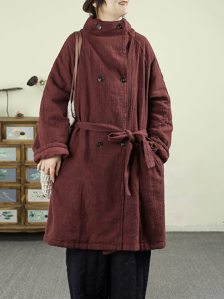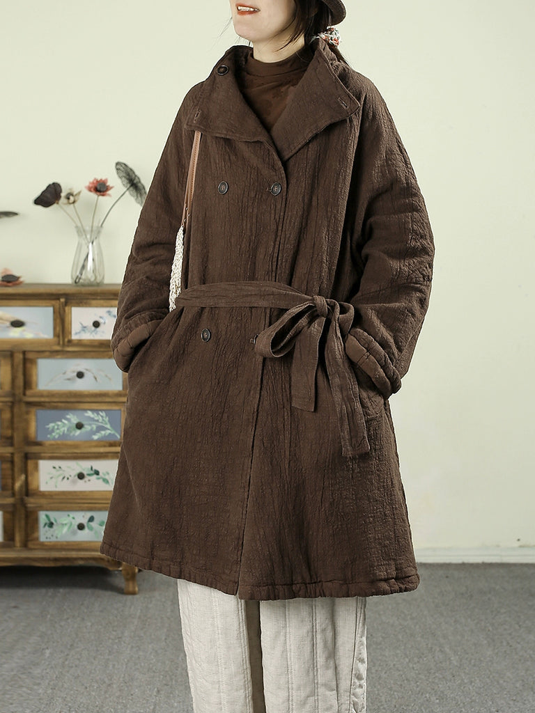 Women Winter Retro Pure Color 100%Linen Padded Trench Coat