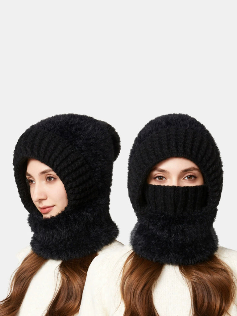 Women Casual Pure Color Plush Knitted Scarf+Hat