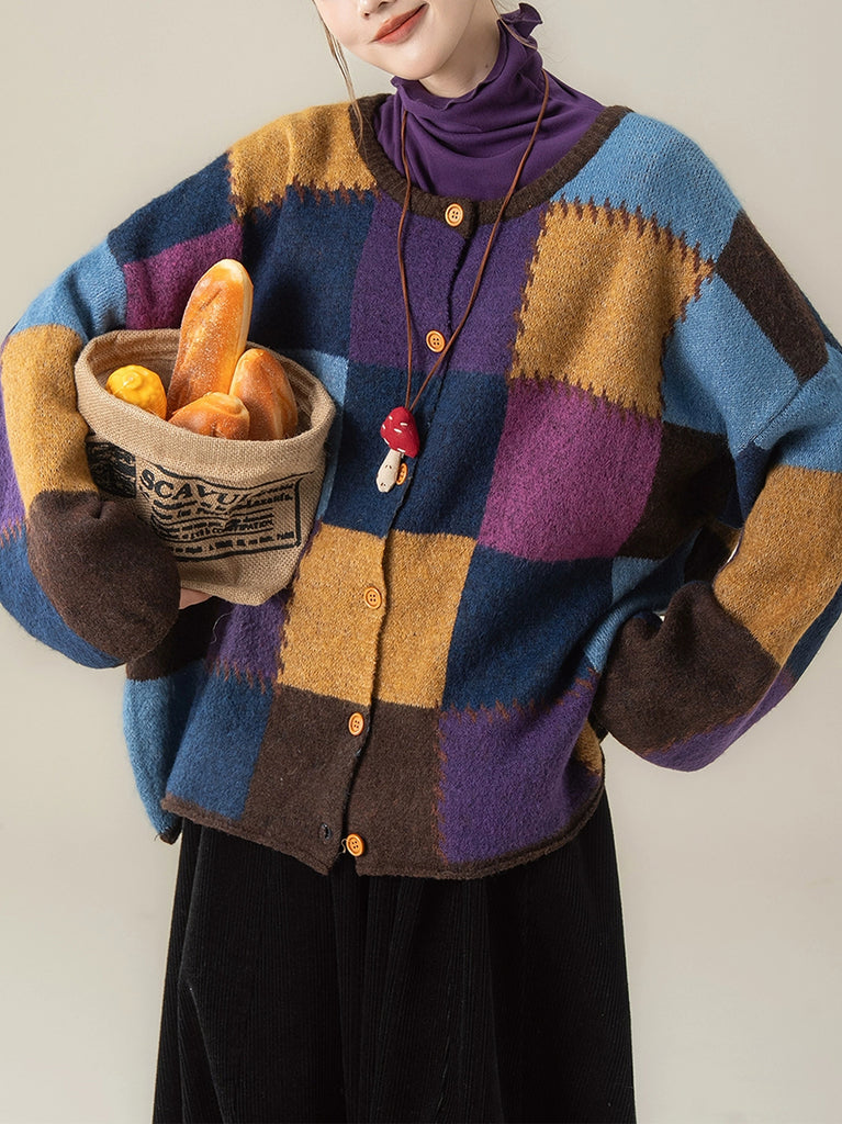 Women Vintage Winter Colorblock Plaid O-Neck Sweater