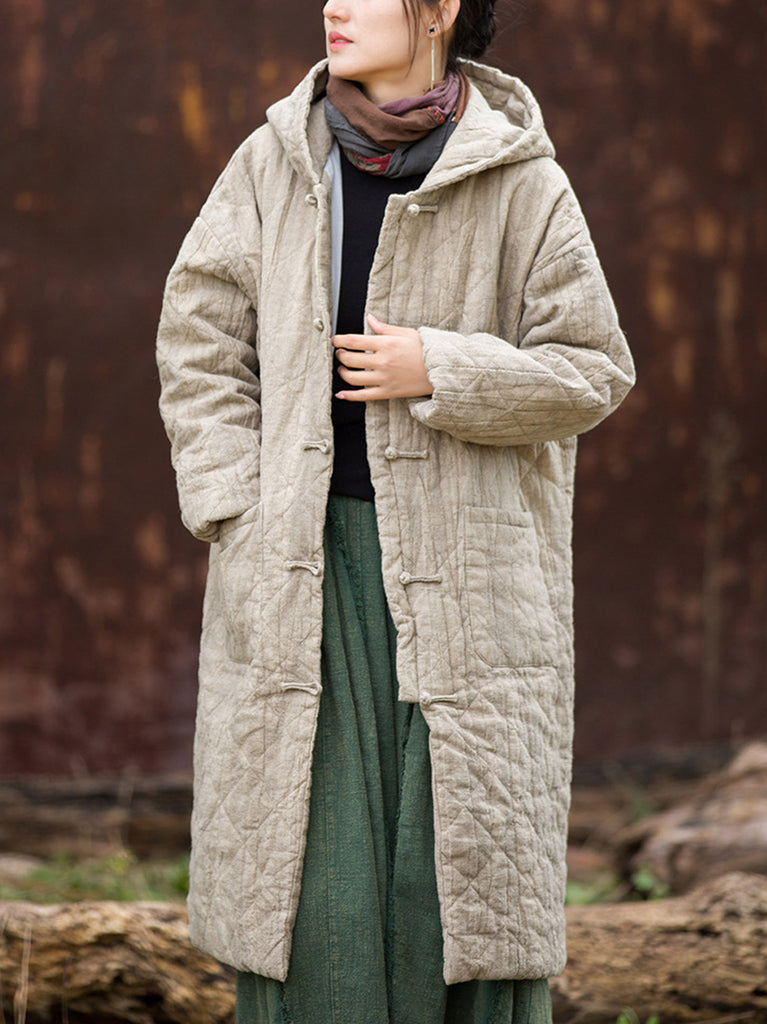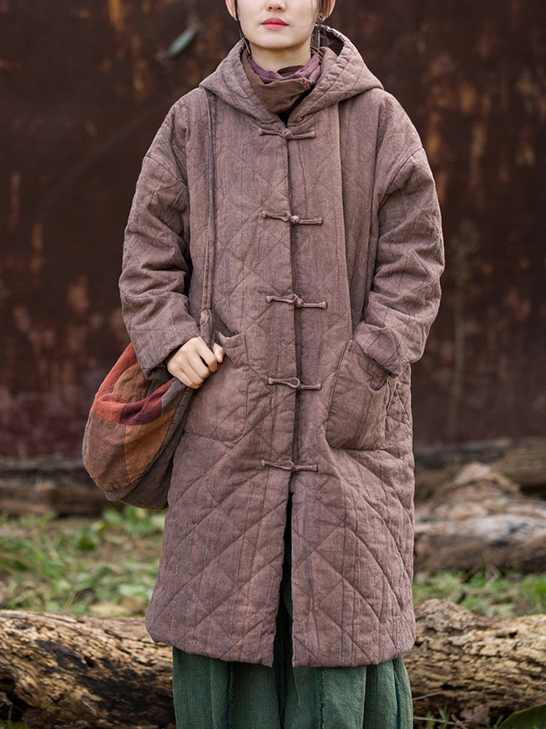 Women Winter Retro Pure Color Ramie Padded Hooded Coat