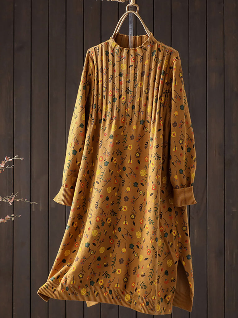 Women Autumn Vintage Flower Half-Turtleneck Knitted Dress