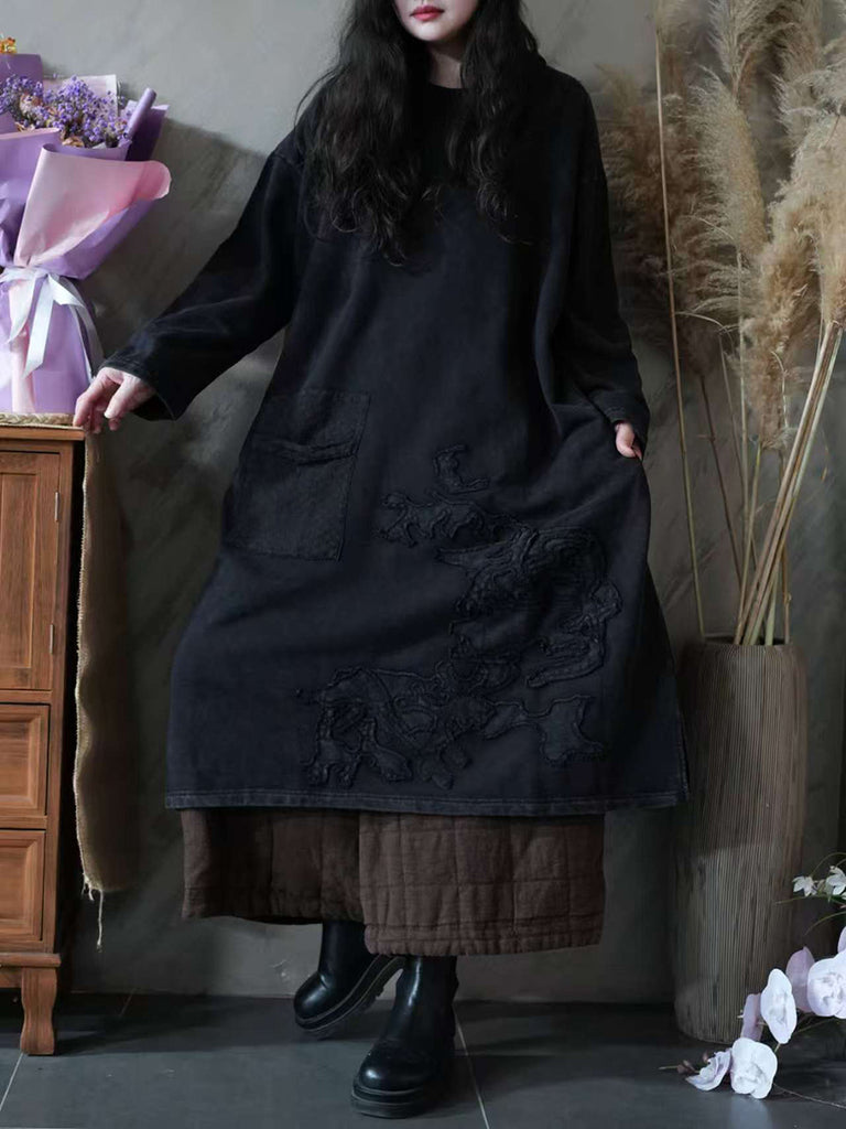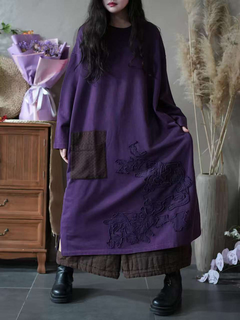 Women Autumn Vintage Patch Spliced O-Neck Dress