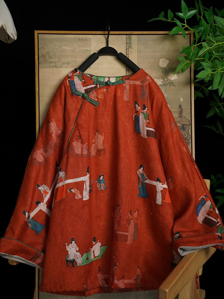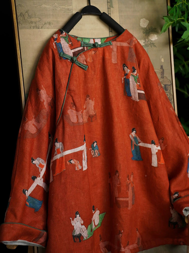 Women Winter Vintage Linen Print O-Neck Padded Coat