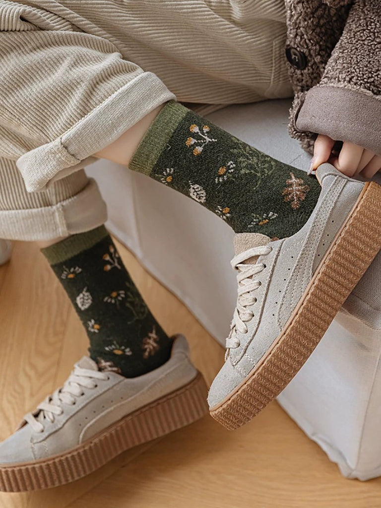 5 Pairs Women Winter Artsy Plaid Flower Jacquard Socks