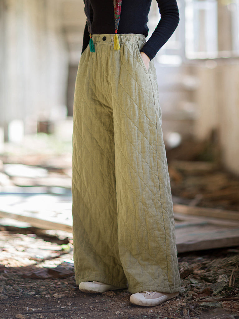 Women Autumn Retro Pure Color Straight Ramie Padded Pants