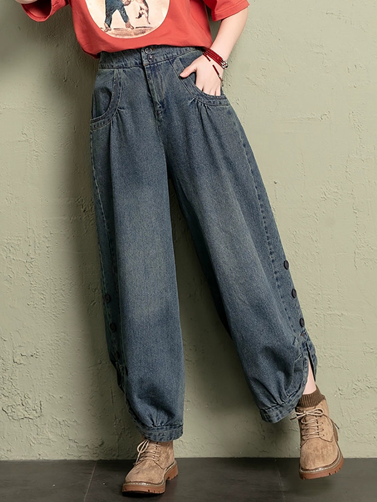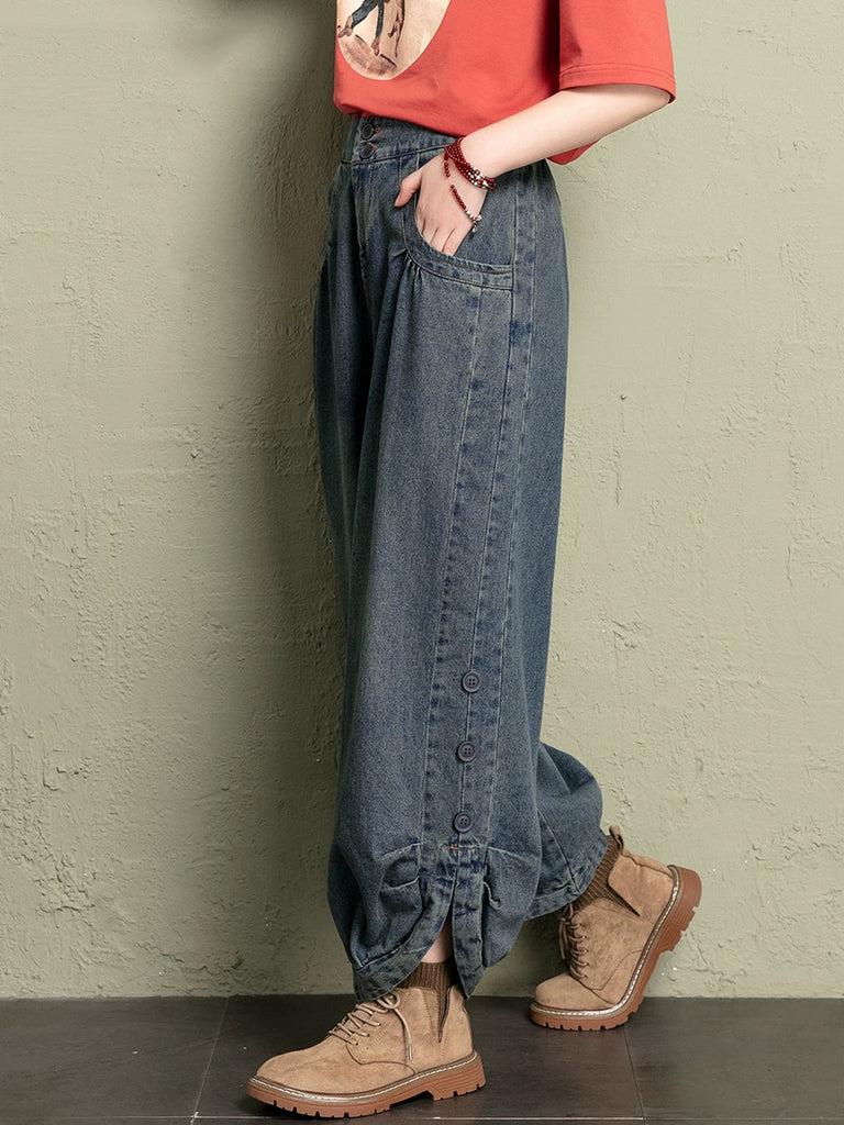 Women Vintage Floral Spliced Cotton Loose Denim Jumpsuits
