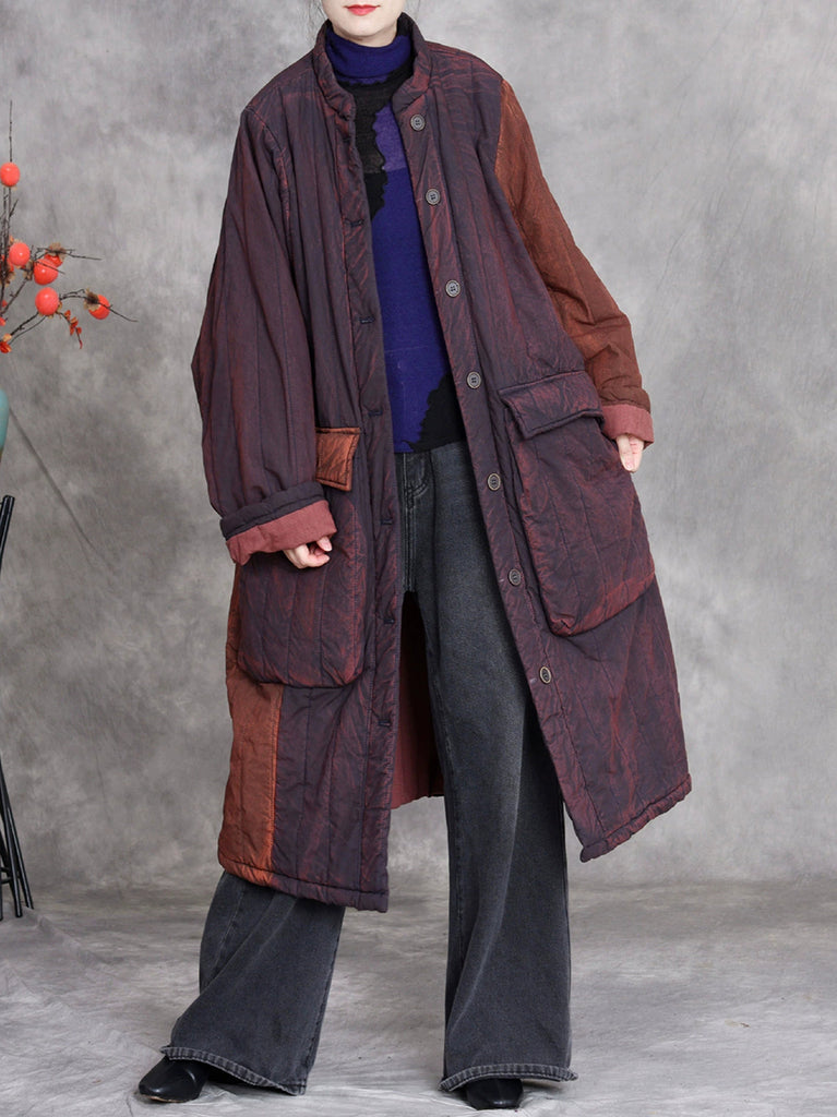 Women Retro Winter Colorblock Stand Collar Padded Coat