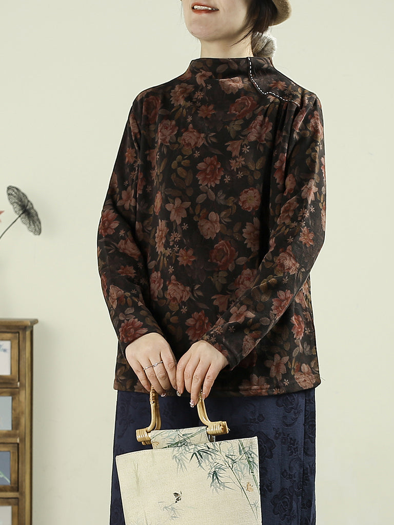 Women Vintage Autumn Flower Half-Turtleneck Blouse