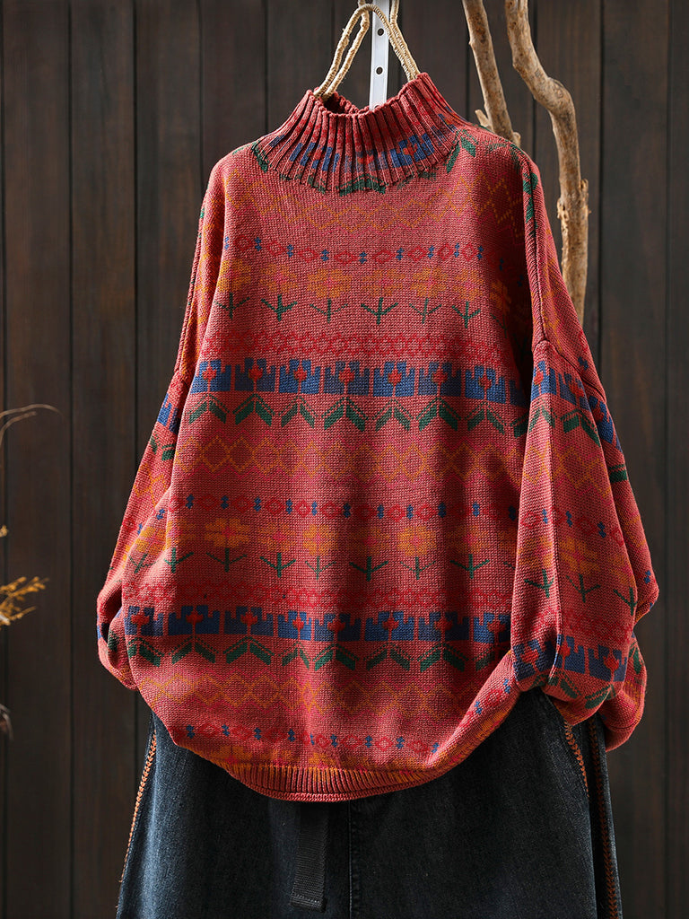Women Autumn Artsy Flower Half-Turtleneck Sweater
