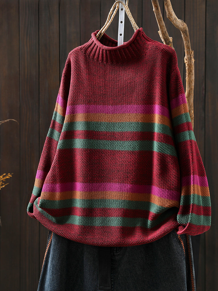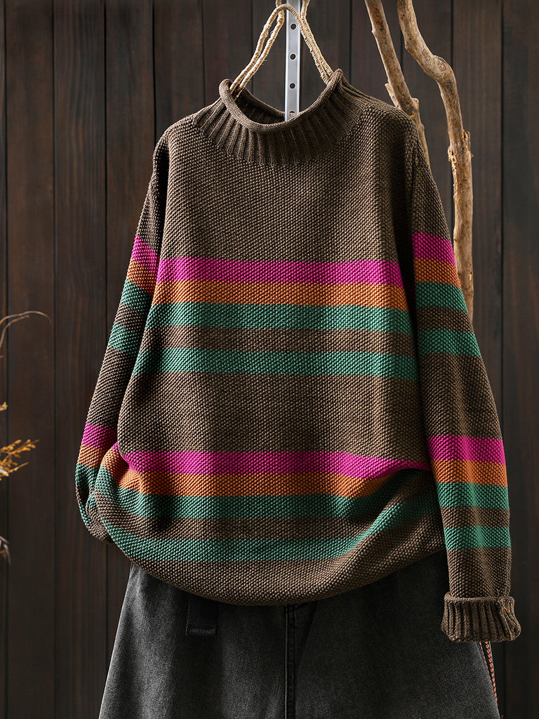 Women Autumn Artsy Stripe Half-Turtleneck Sweater