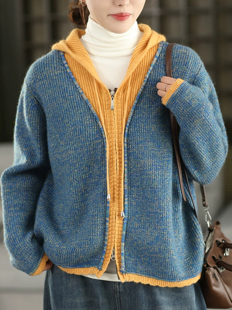 Women Autumn Retro Colorblock Hooded Sweater Coat