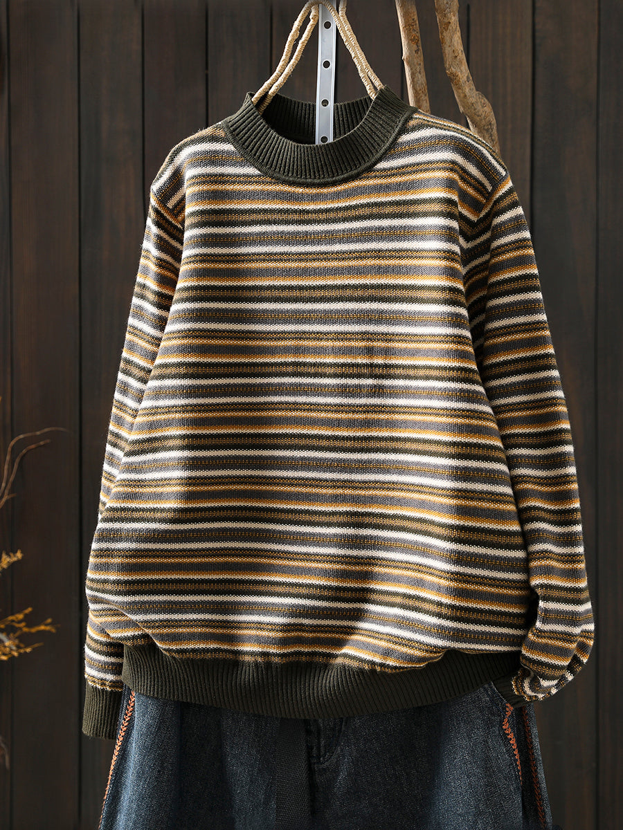 Women Autumn Artsy Stripe Half-Turtleneck Sweater