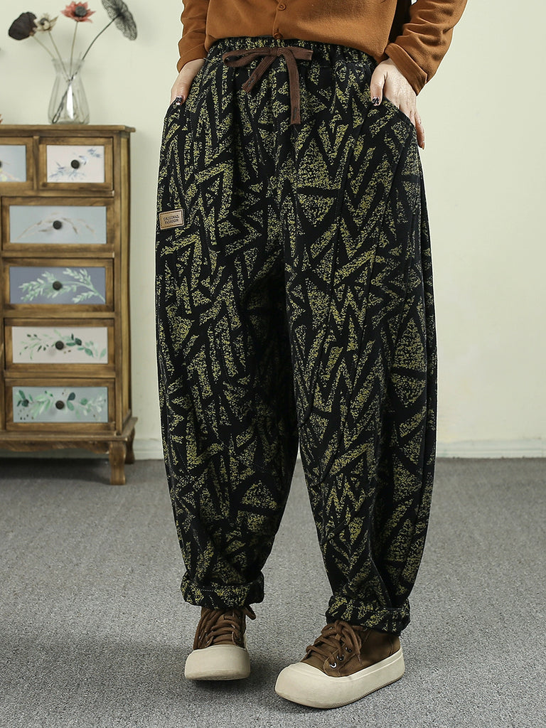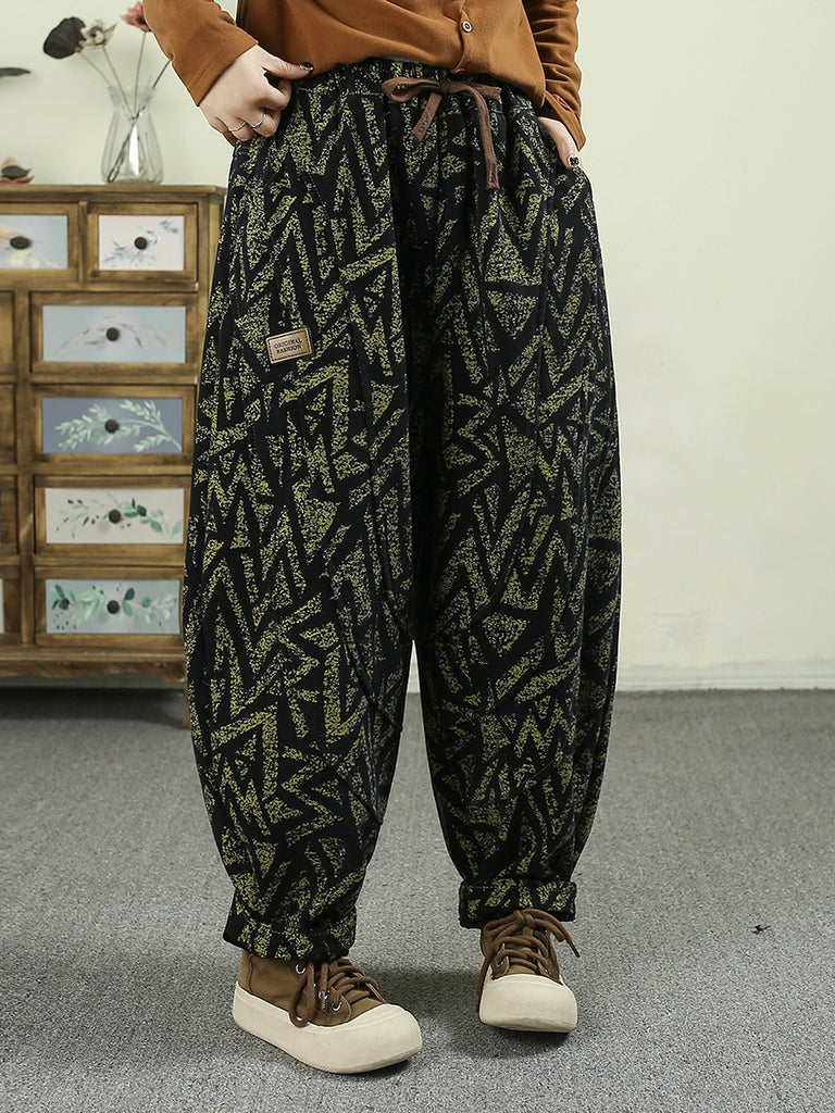 Women Winter Retro Geometric Fleece-lined Harem Pants