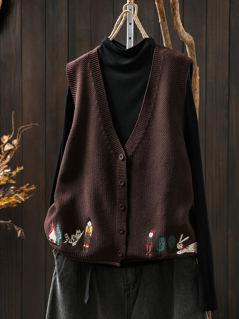 Women Winter Cartoon Embroidery V-Neck Knitted Vest