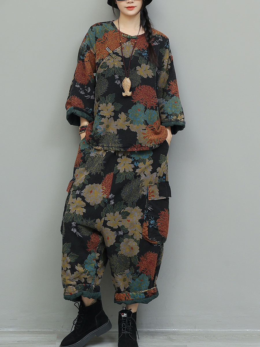 Women Winter Ethnic Flower O-Neck Padded Suits