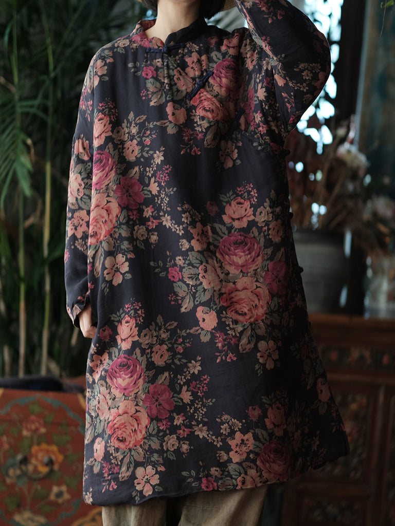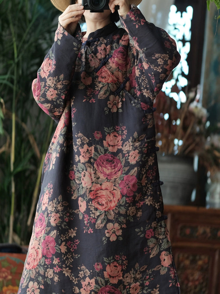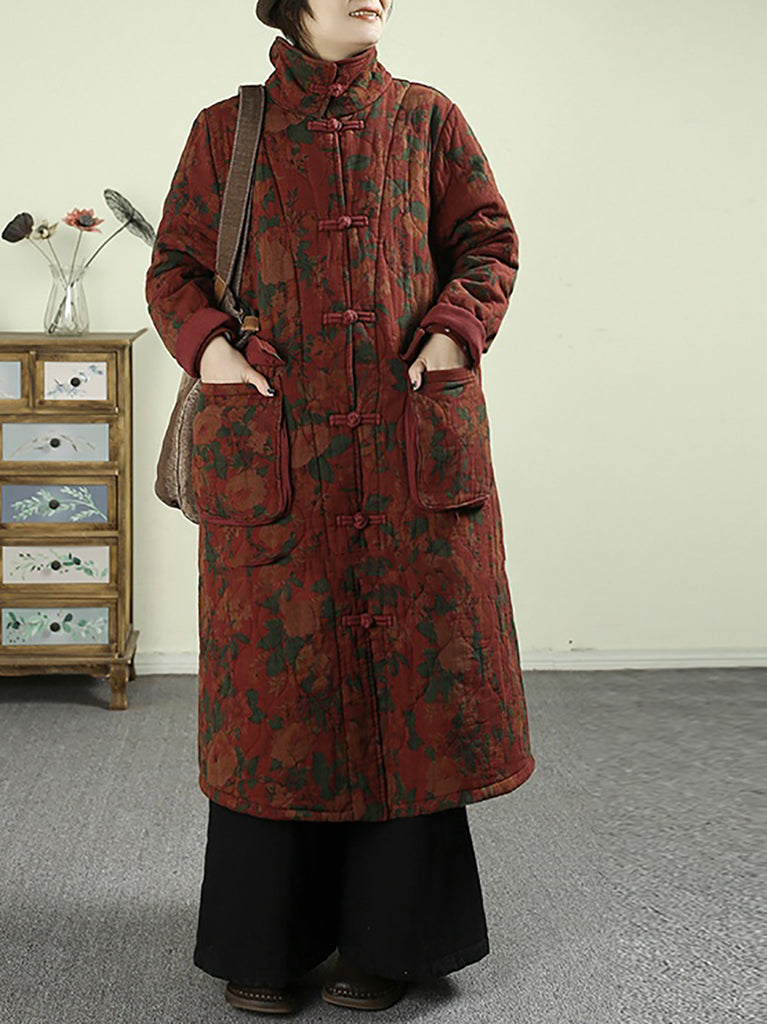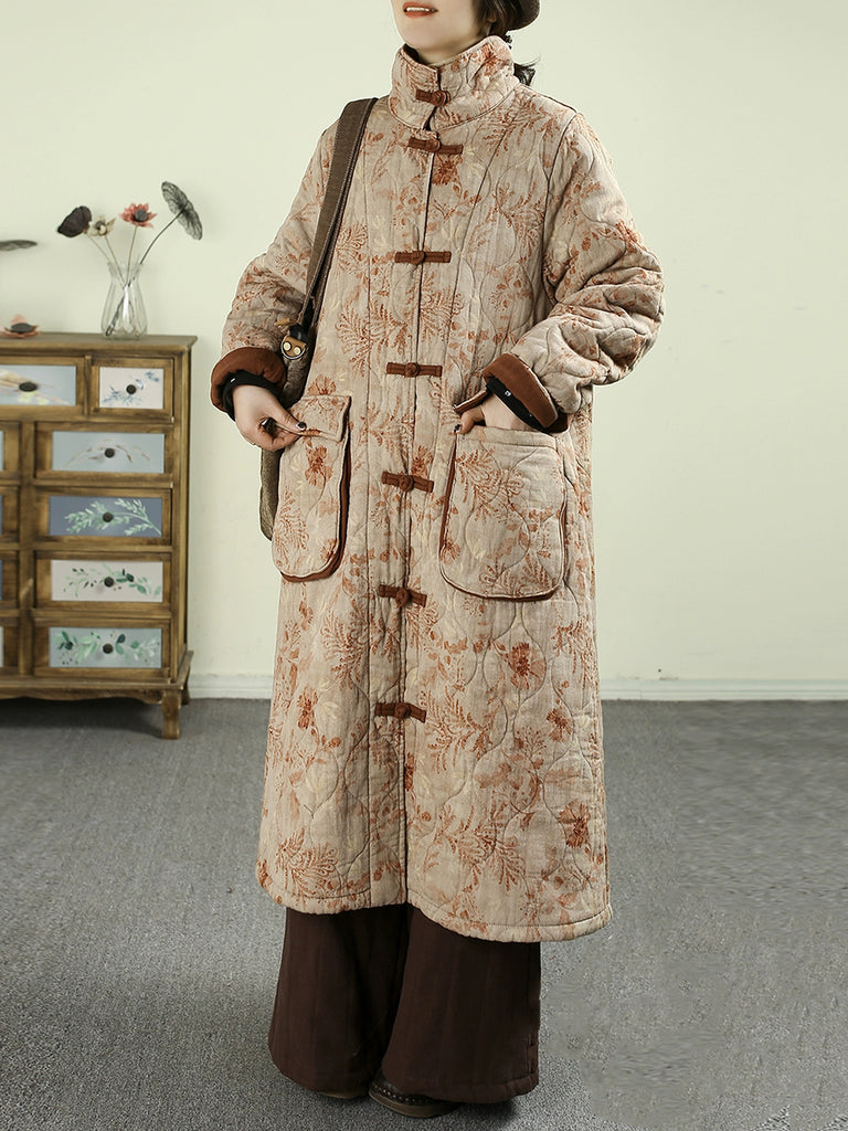 Women Winter Retro Flower Stand Collar Padded Robe Coat