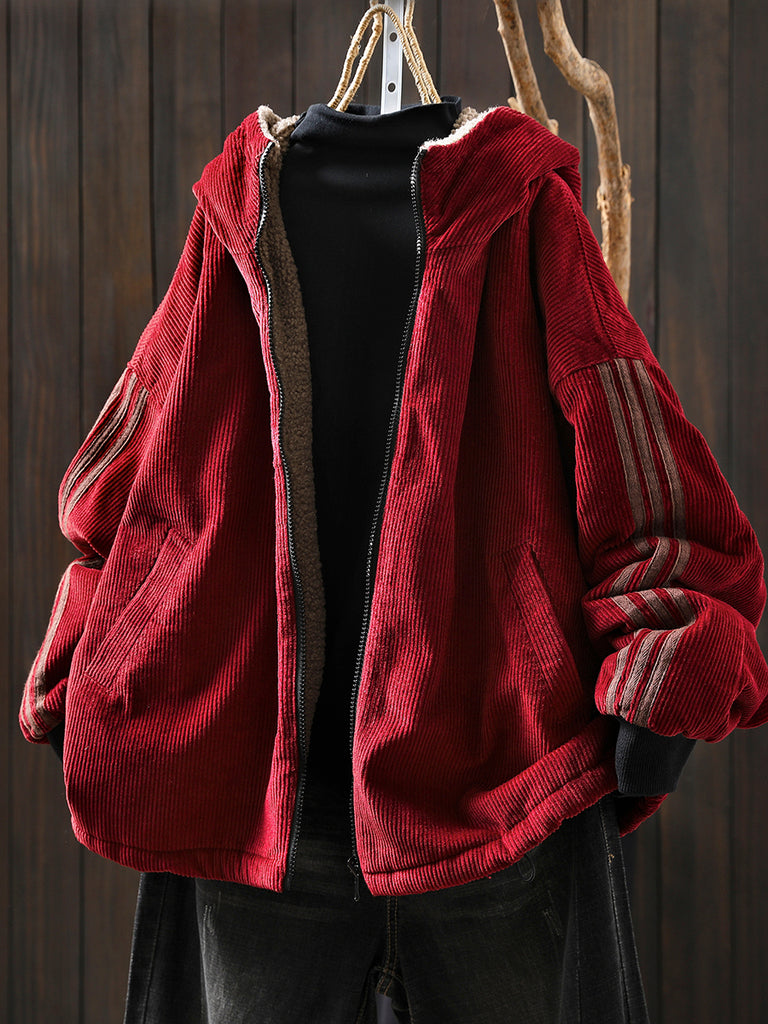 Women Winter Retro Pure Color Fleece-lined Corduroy Hooded Coat