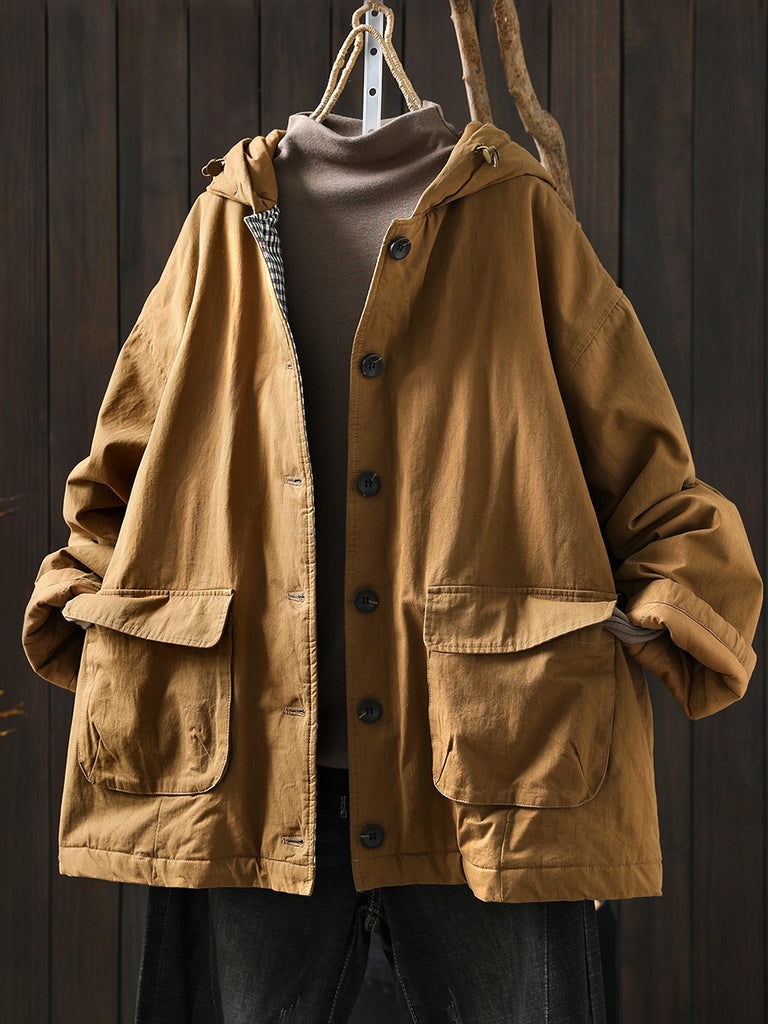 Women Winter Retro Pure Color Padded Hooded Coat