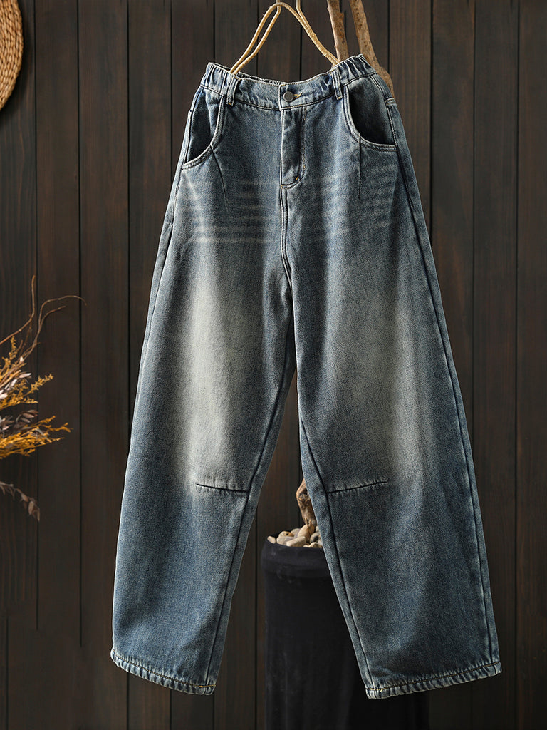 Women Winter Pure Color Fleece-lined Wide-leg Denim Pants