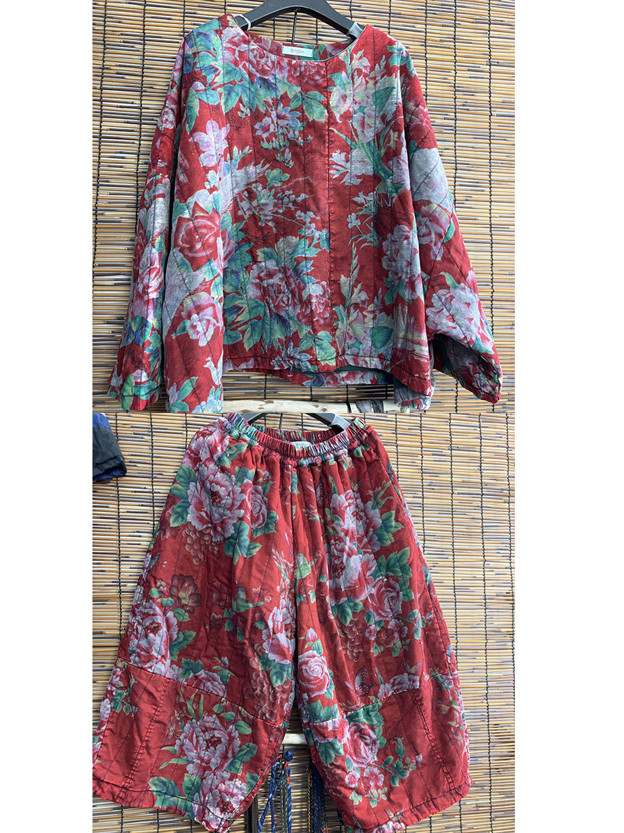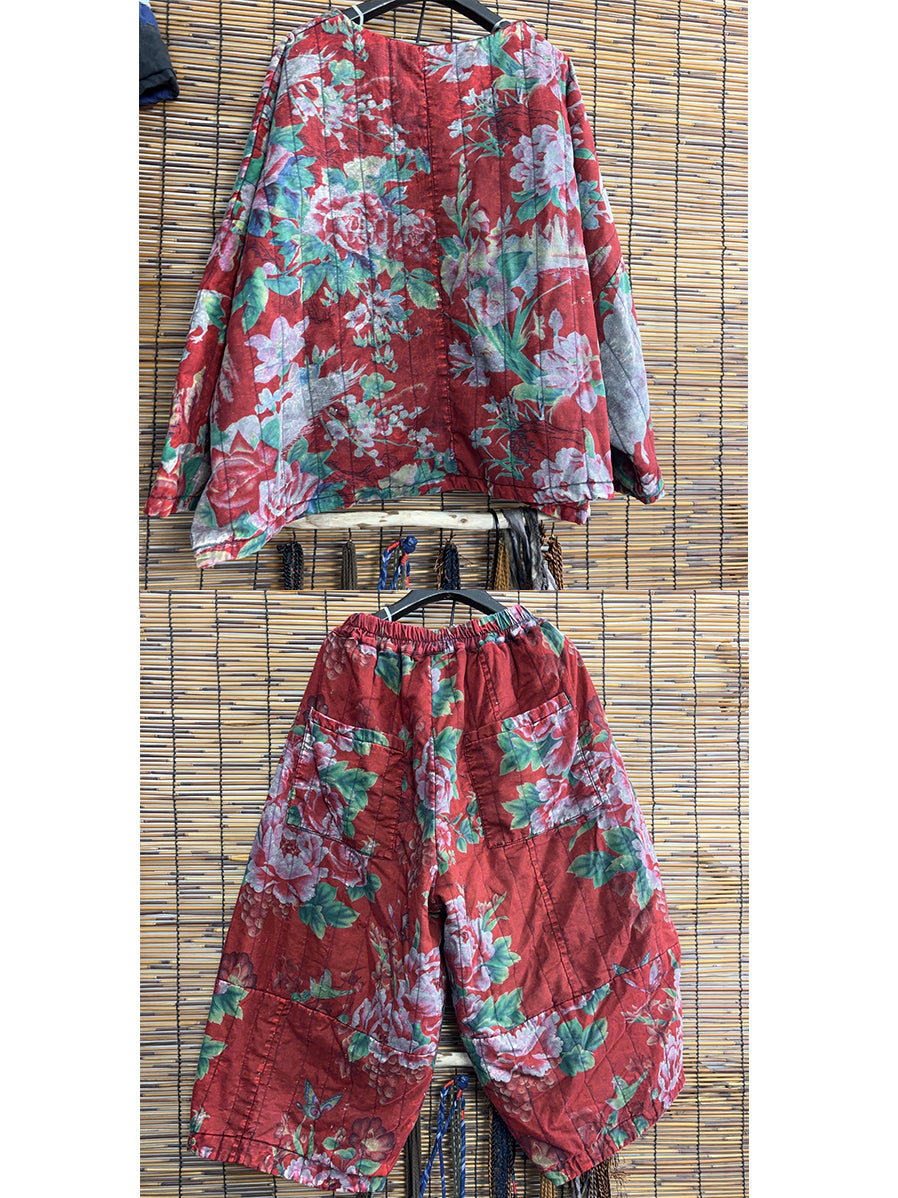 Women Winter Ethnic Flower Spliced O-Neck Padded Suits