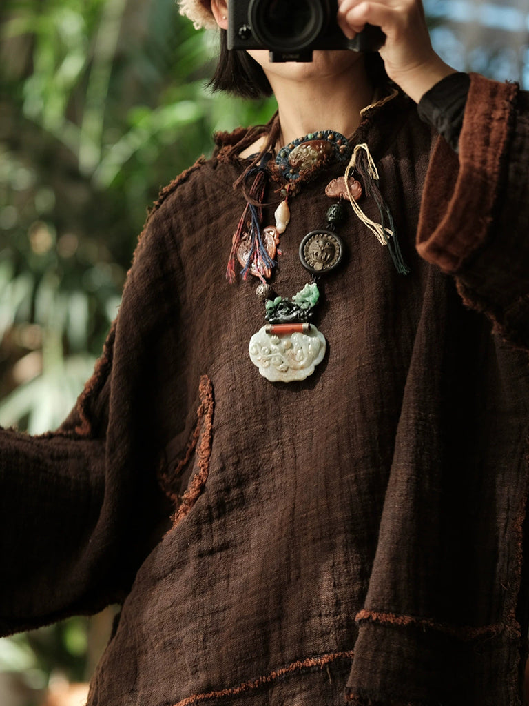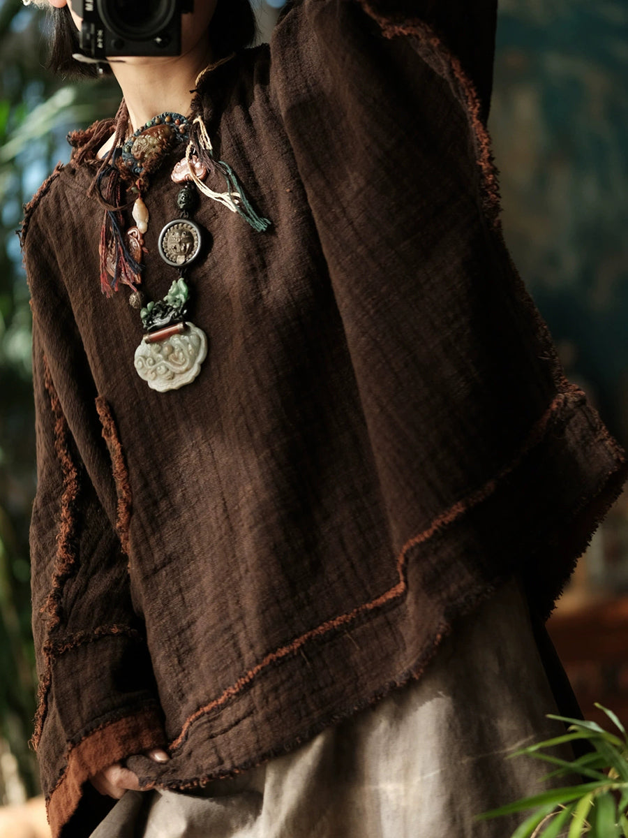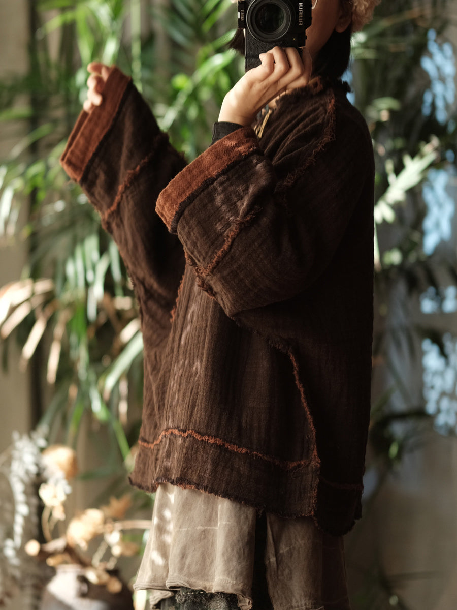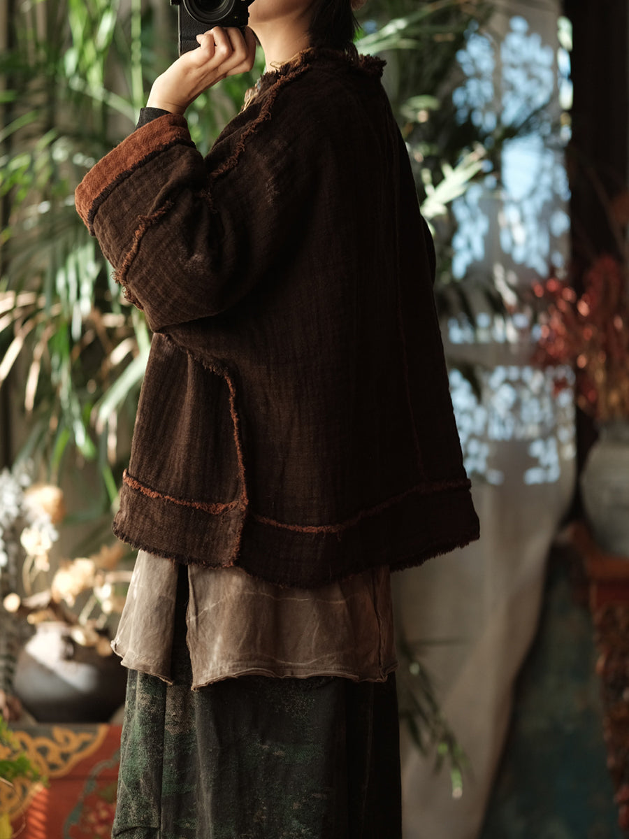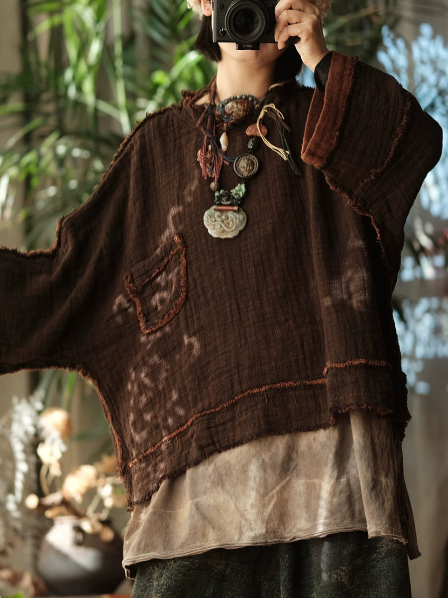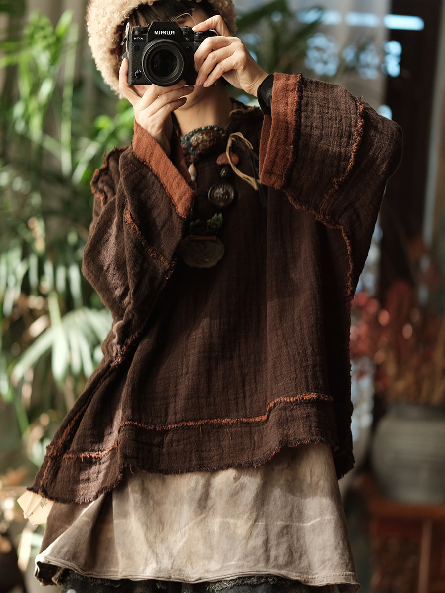Women Winter Retro Raw-edge Spliced O-Neck Blouse