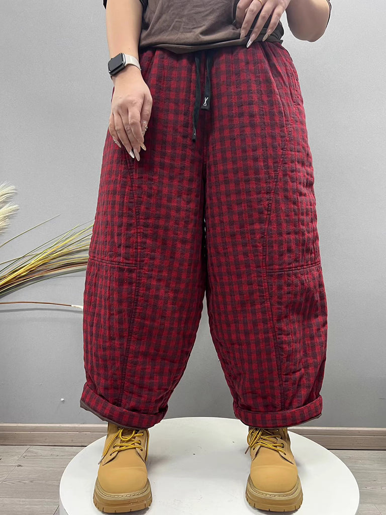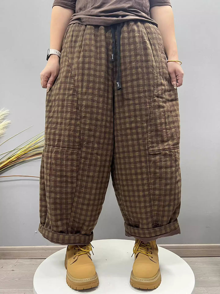 Women Winter Retro Plaid Fleece-lined Harem Pants