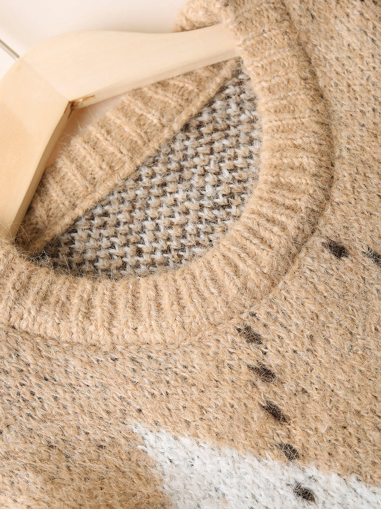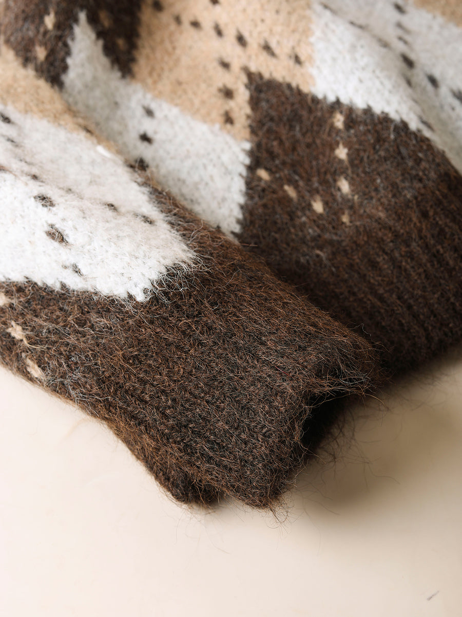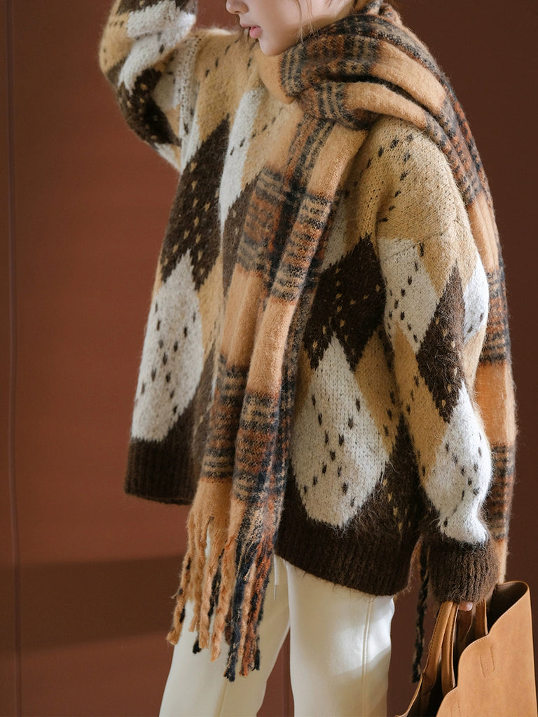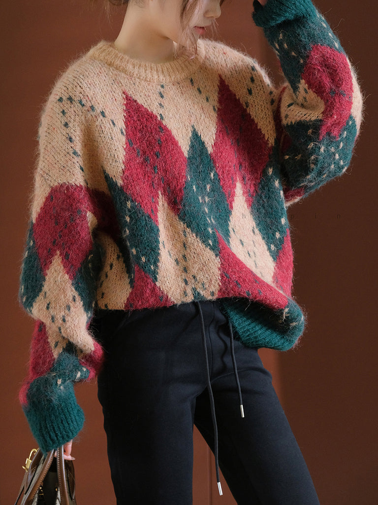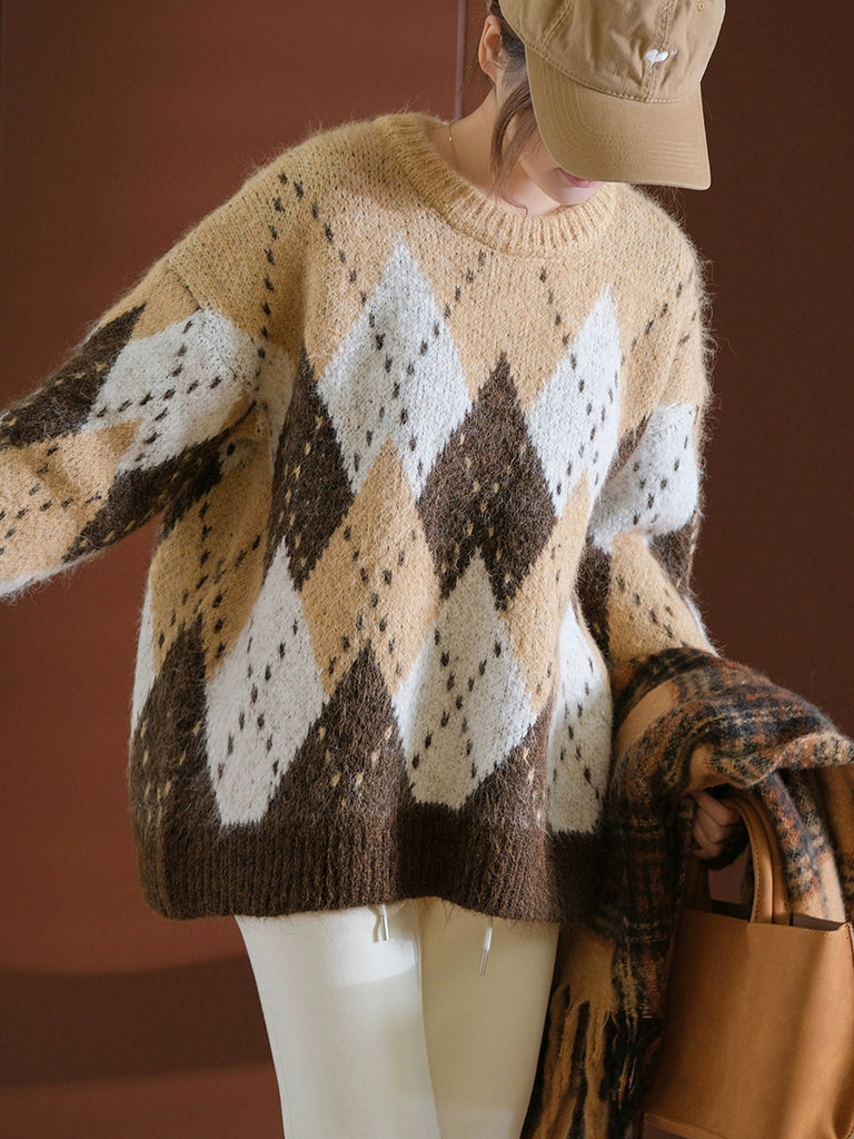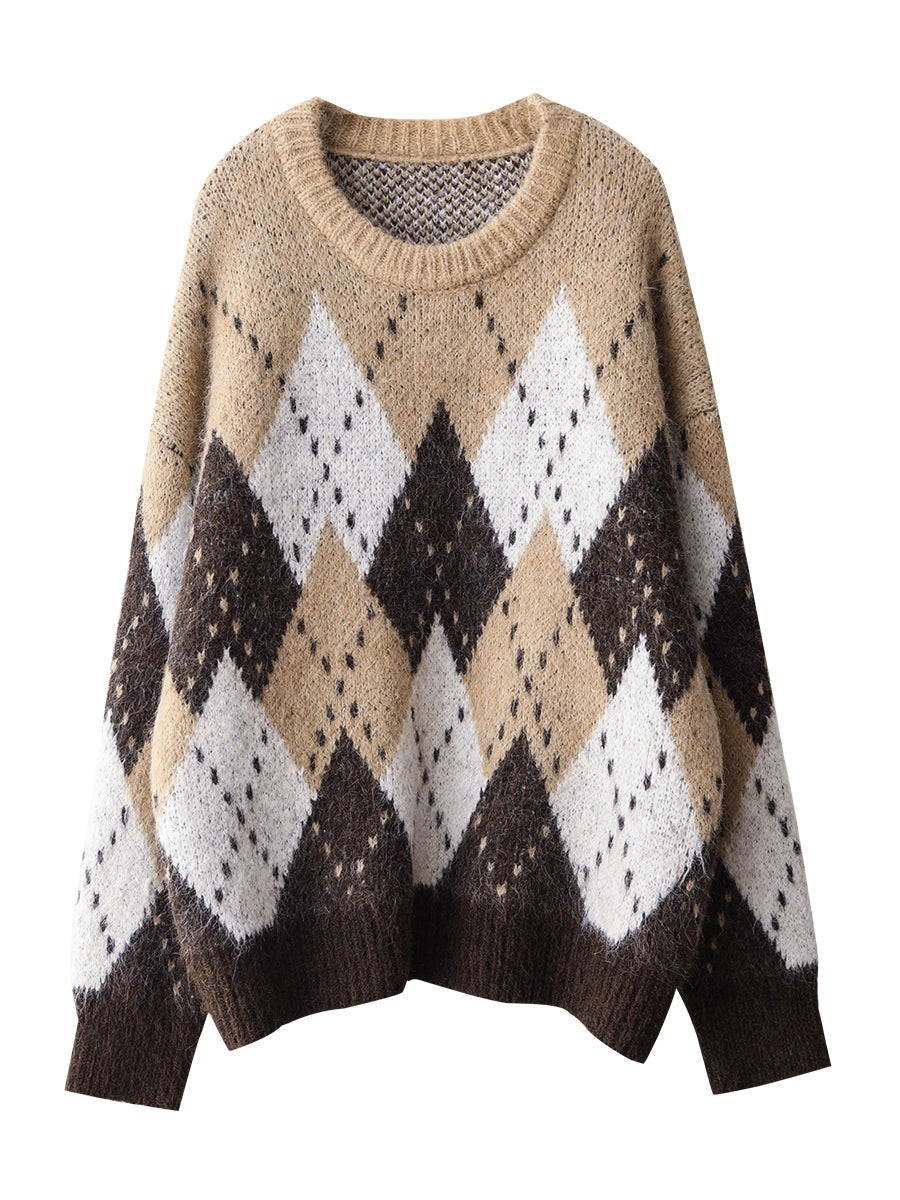 Women Autumn Retro Rhomboids Knitted O-Neck Sweater