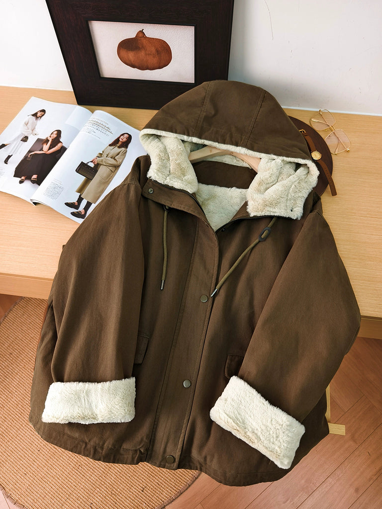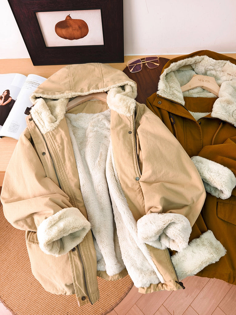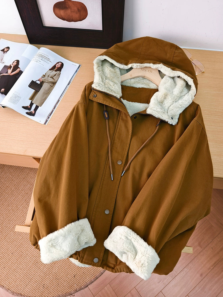 Women Winter Casual Pure Color Fleece-lined Hooded Coat