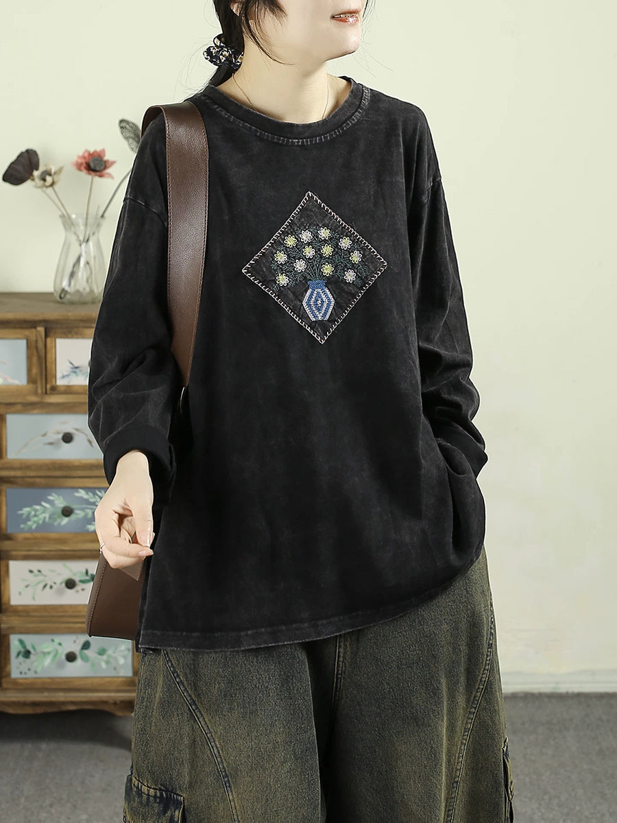 Women Artsy Spring Flower Patch Cotton O-Neck Blouse