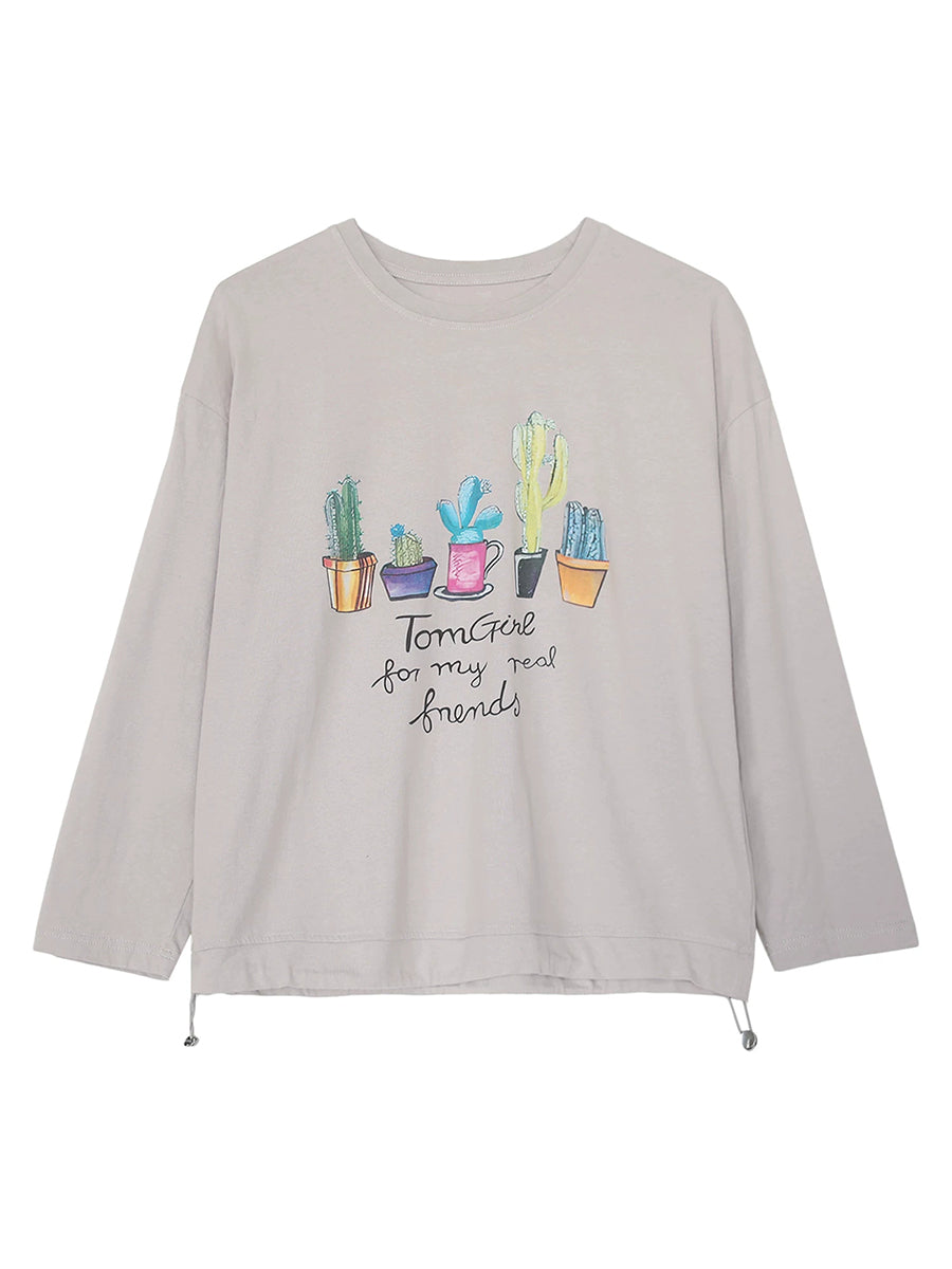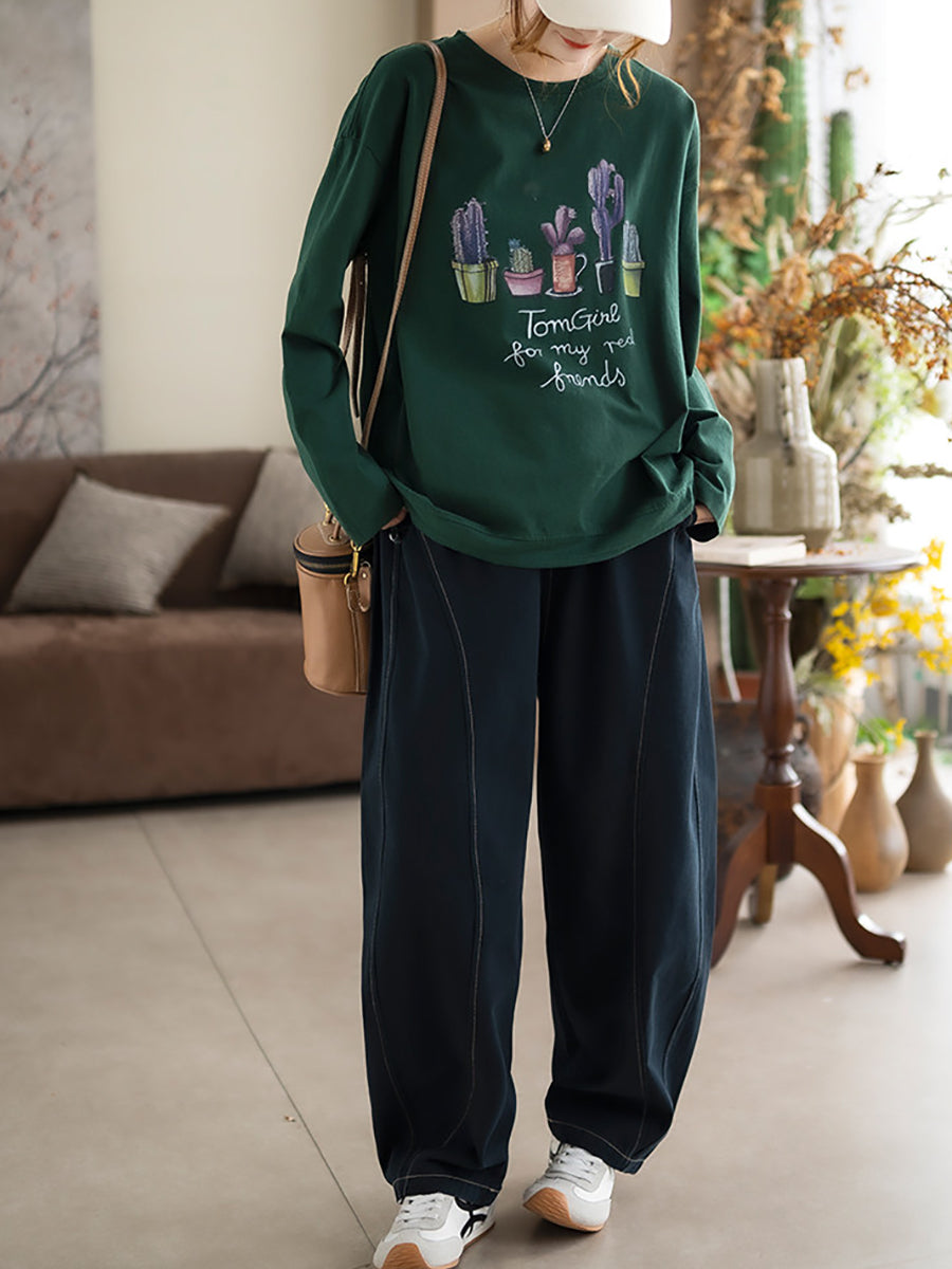 Women Spring Artsy Plants Cotton O-Neck Blouse