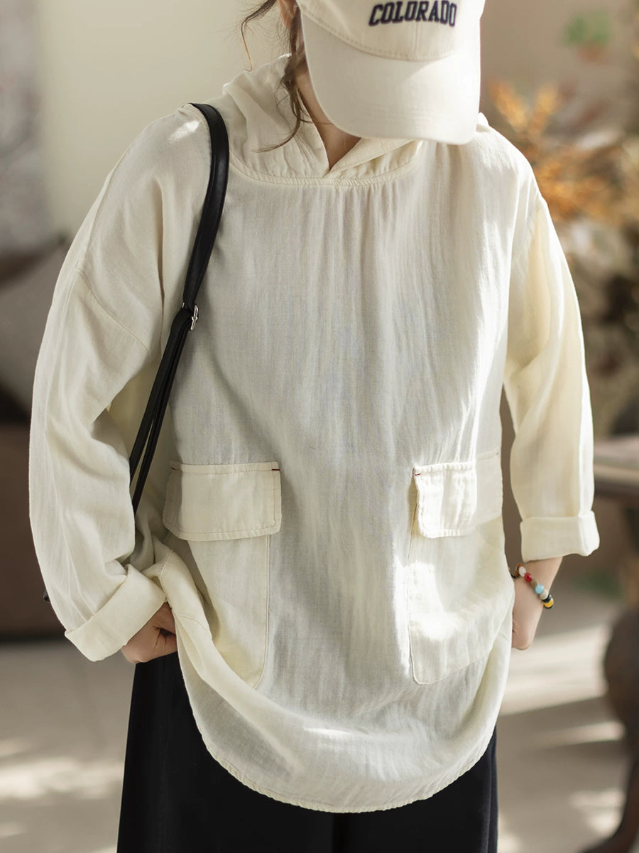 Women Spring Casual Pure Color Hooded Blouse