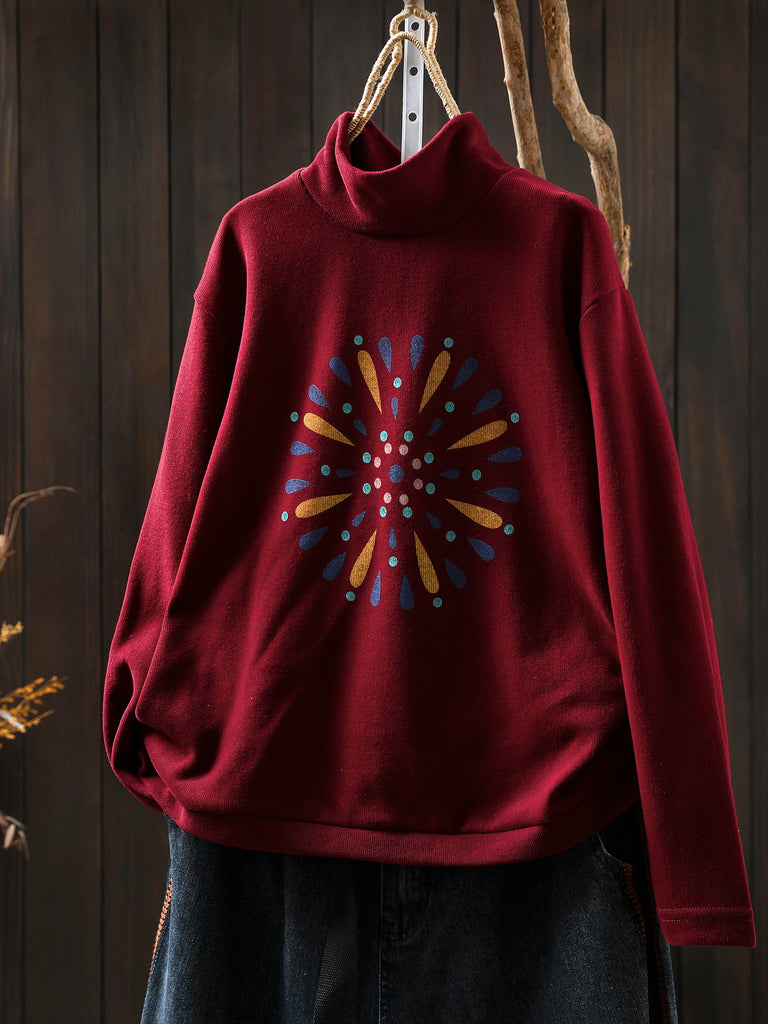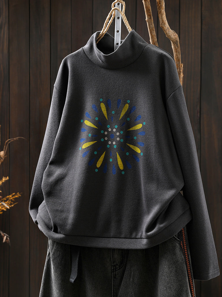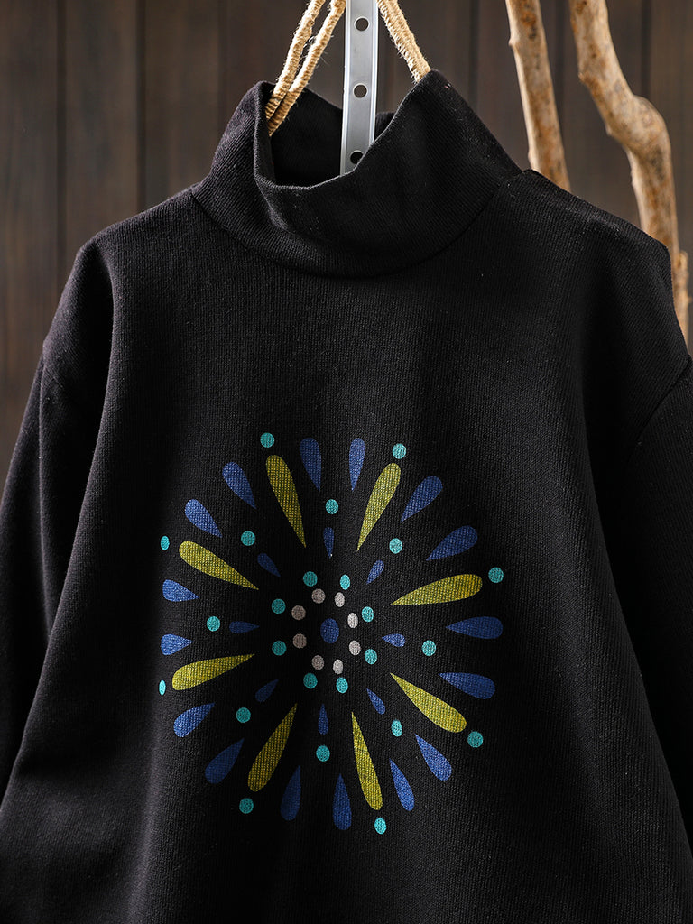 Women Autumn Casual Print Cotton Turtleneck Shirt