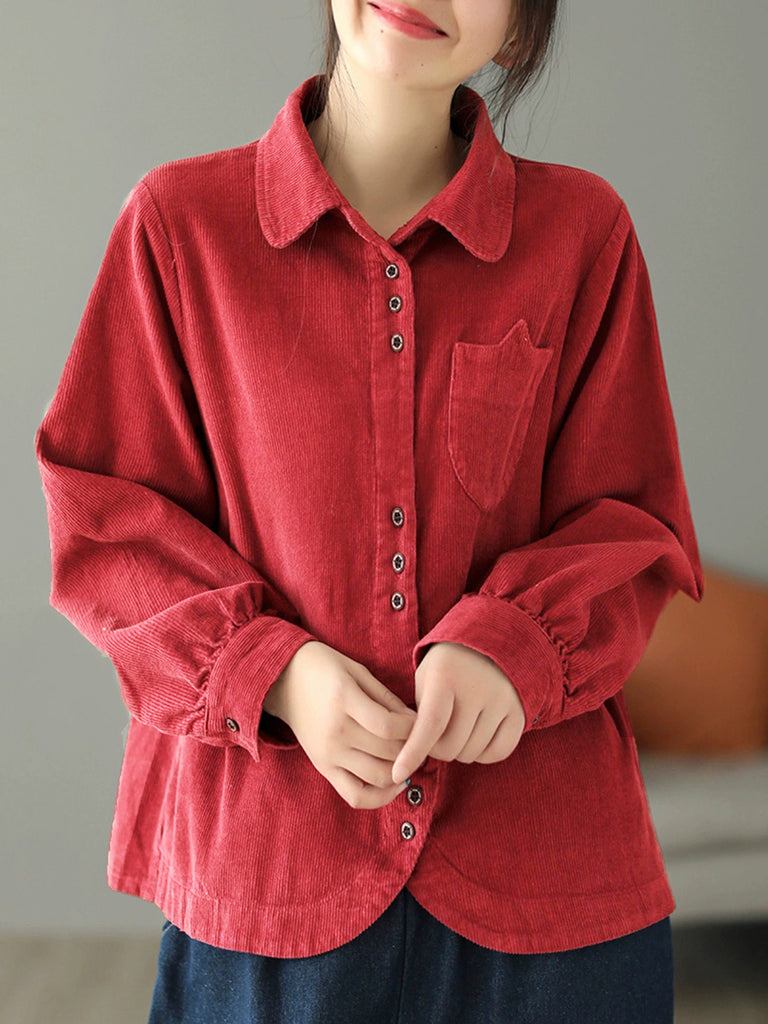 Plus Size Women Autumn Pure Color Turn-down Collar Corduroy Shirt