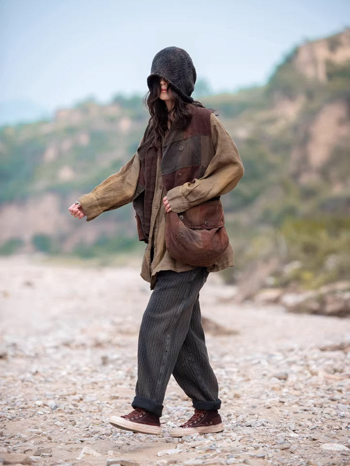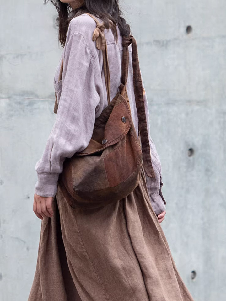 Vintage Brown Plant-dyed Linen Patchwork Messenger Bag