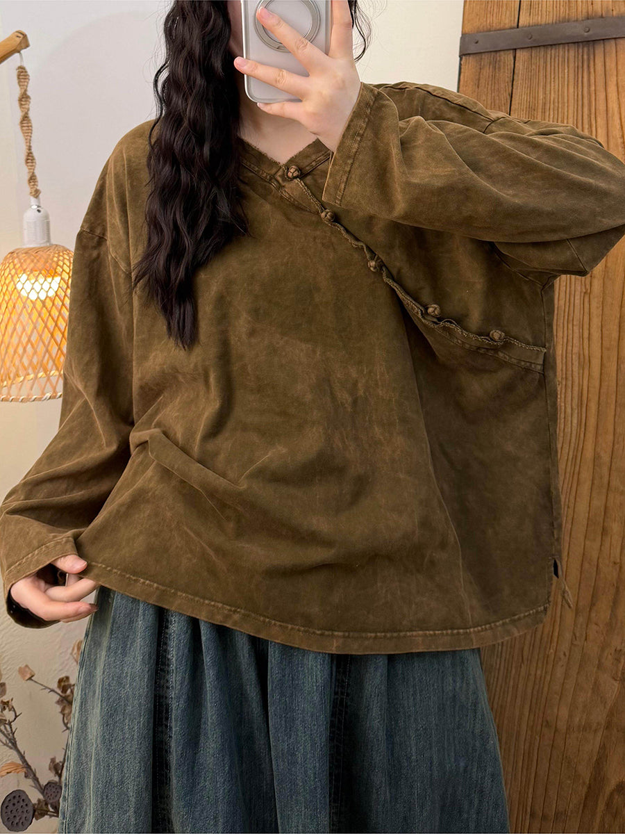 Women Artsy Spring Vintage V-Neck Cotton Blouse