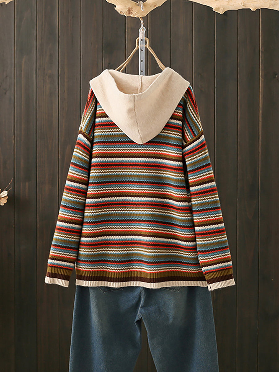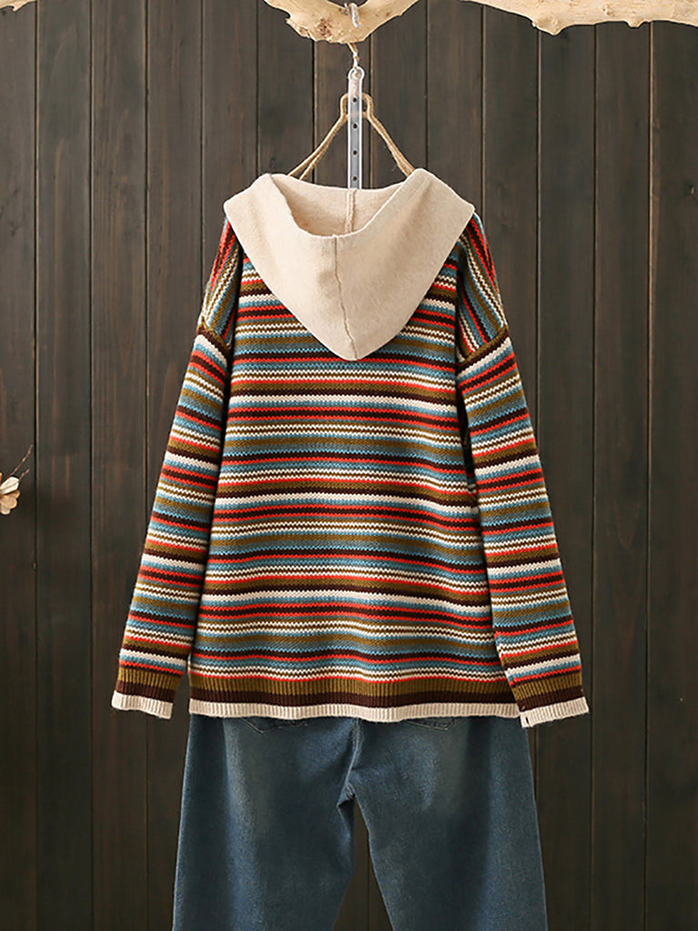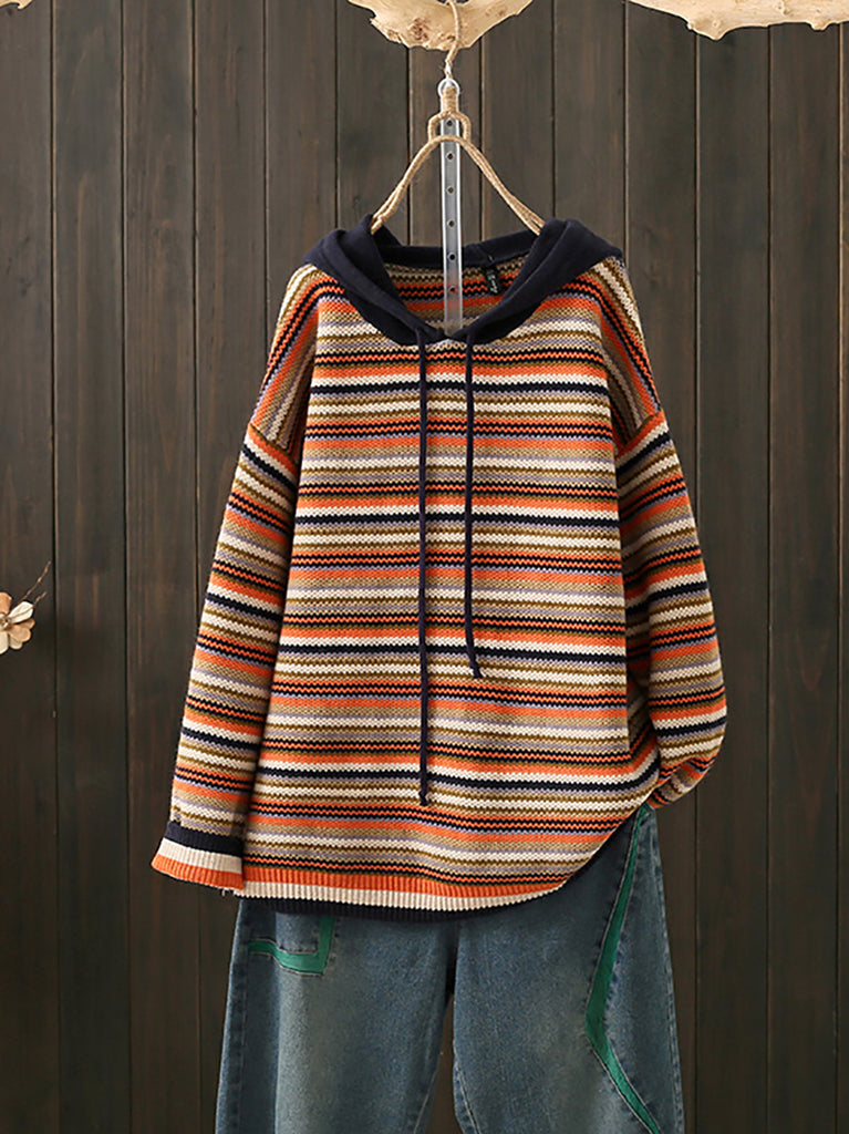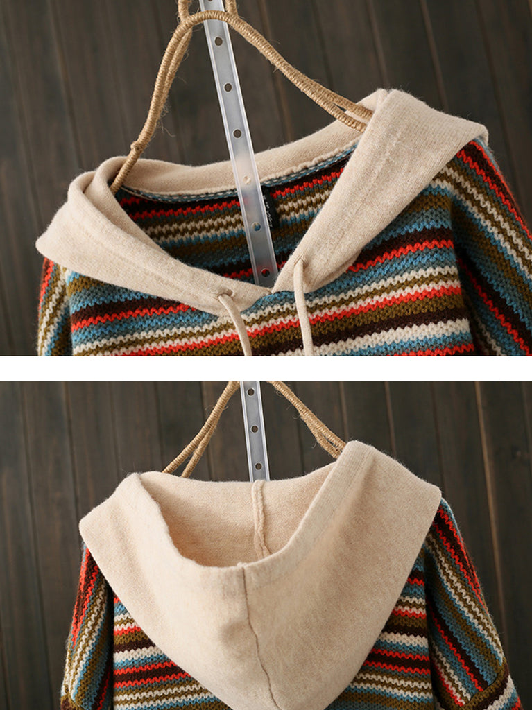 Women Autumn Casual Colorblock Stripe Hooded Sweater