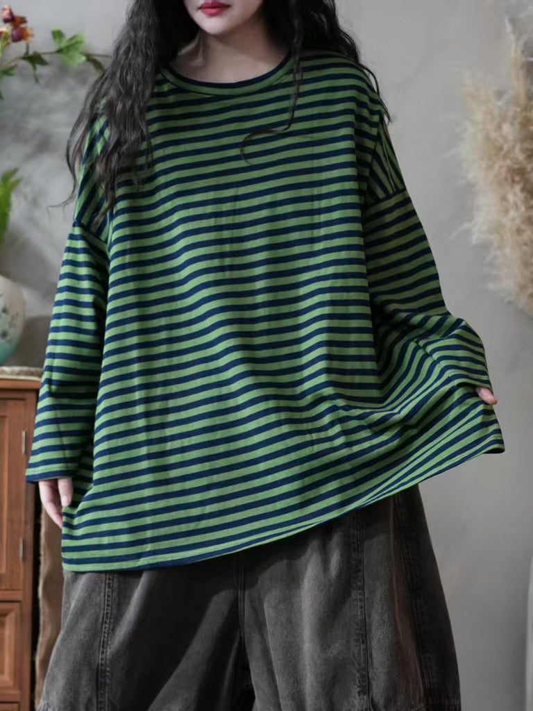 Women Autumn Casual Stripe 100%Cotton O-Neck Blouse