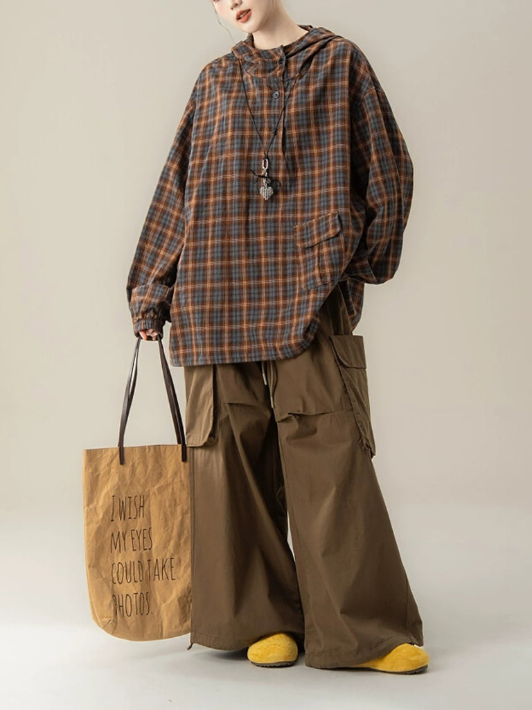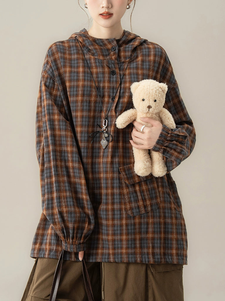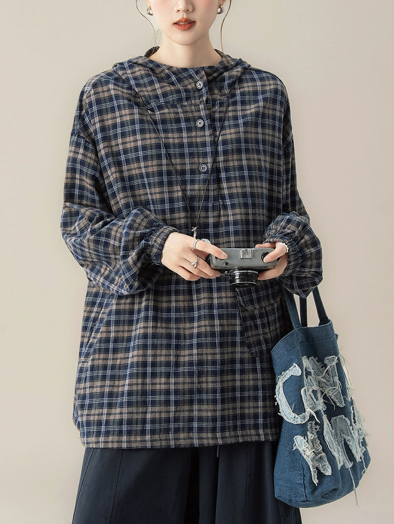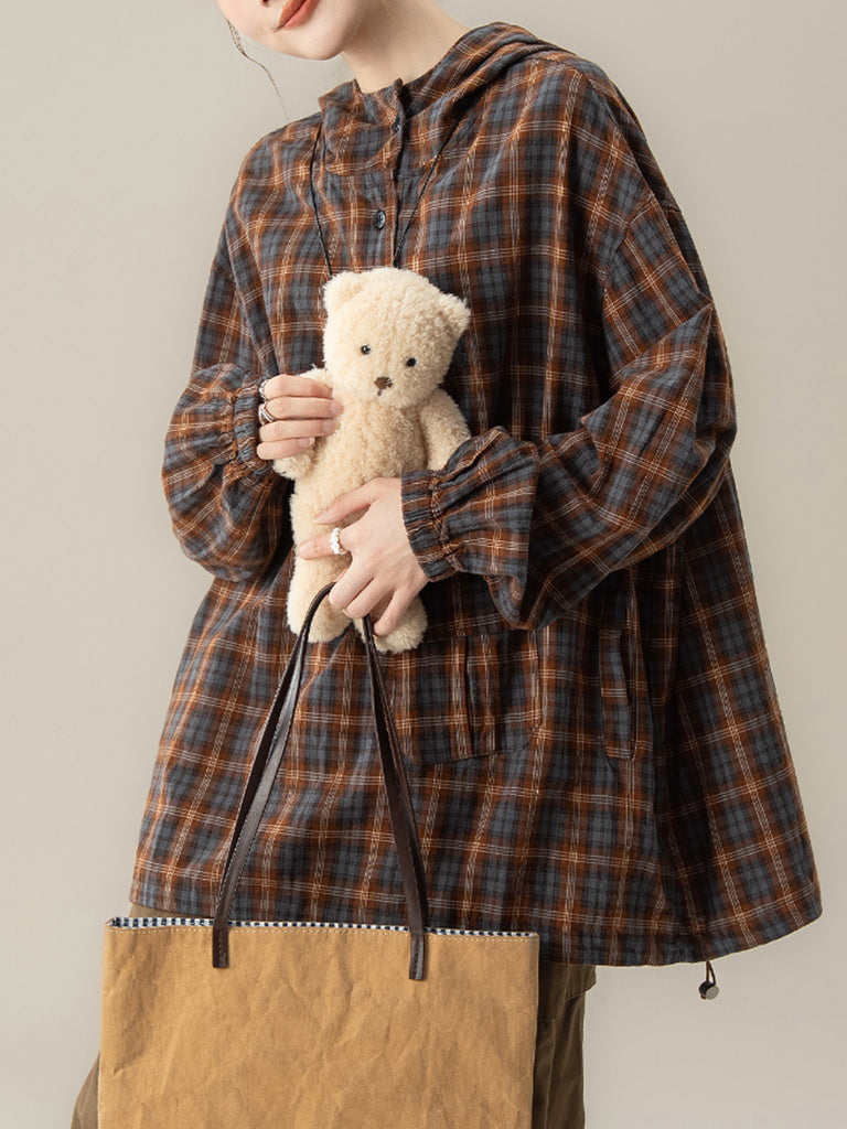 Women Autumn Plaid Hooded Loose Blouse