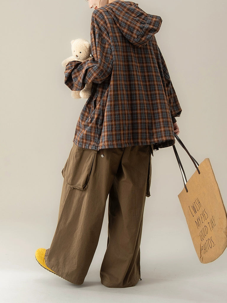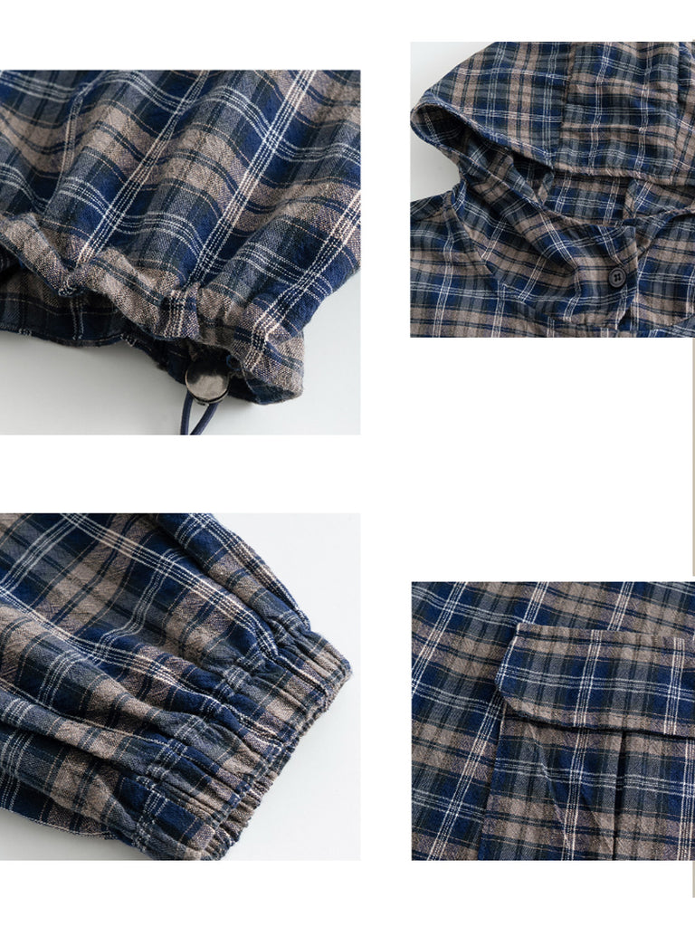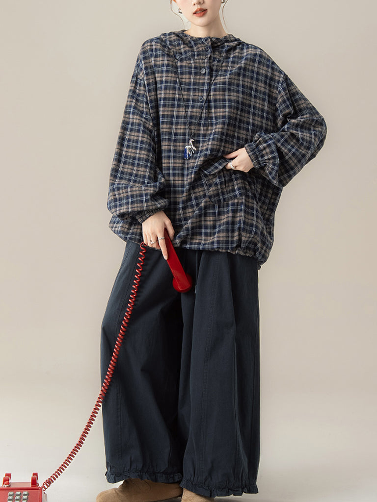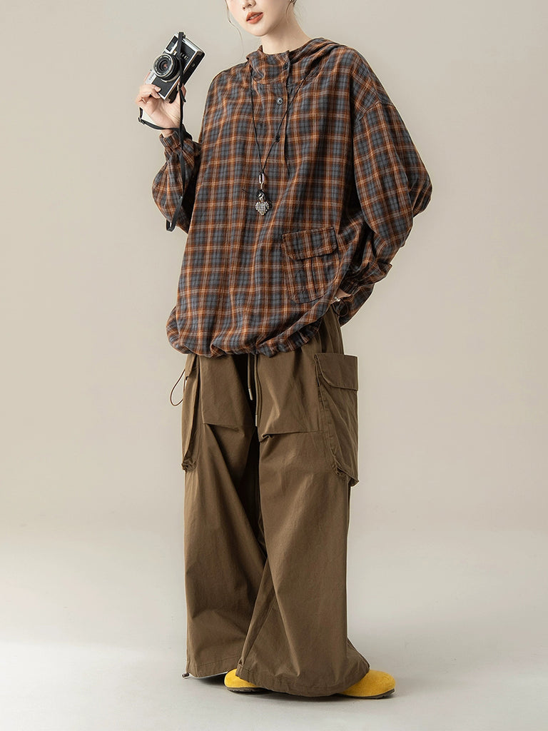 Women Autumn Plaid Hooded Loose Blouse
