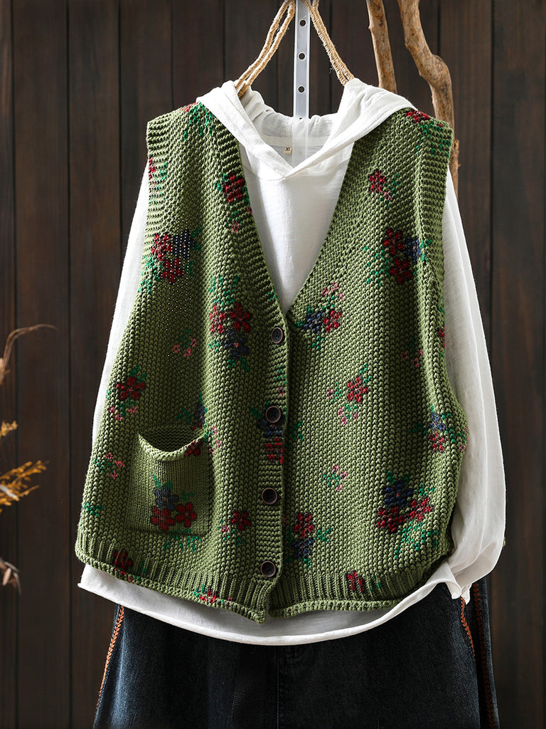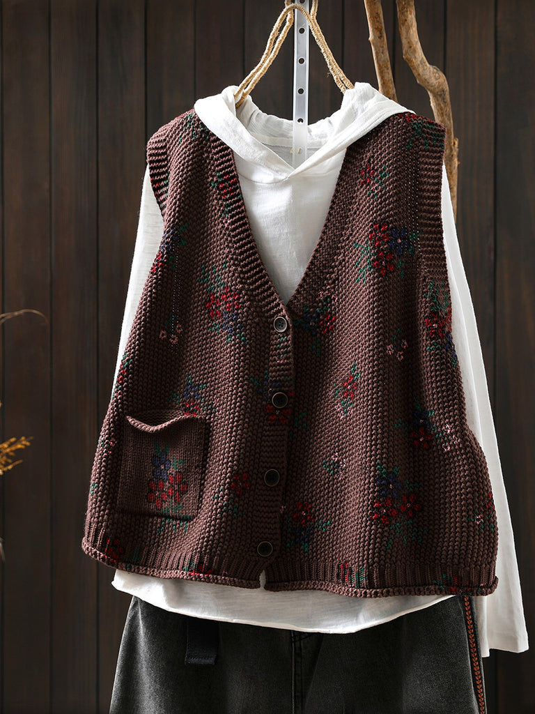 Women Autumn Retro Floral V-Neck Knitted Vest