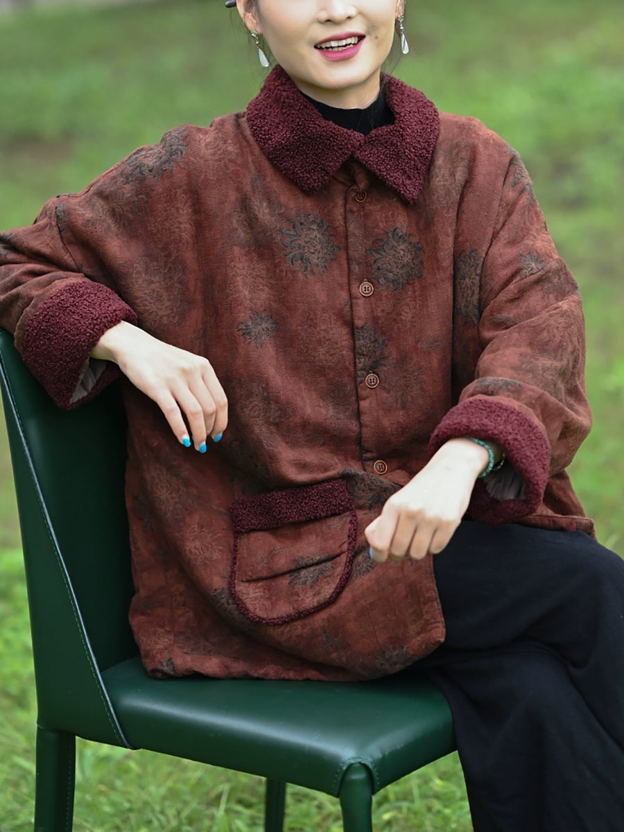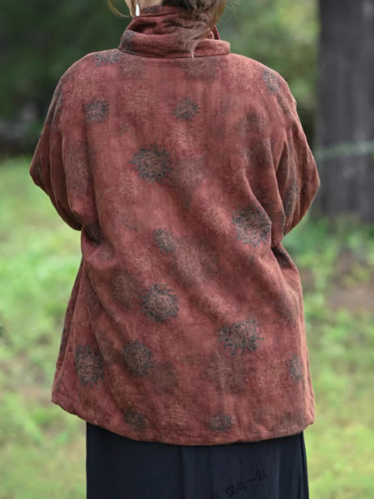 Women Autumn Retro Flower Turn-down Collar Padded Jacket
