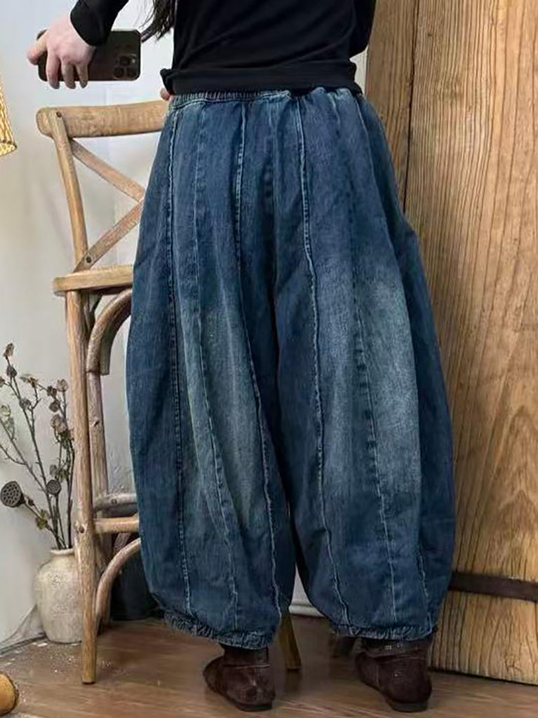 Women Autumn Retro Pure Color Denim Spliced Harem Pants