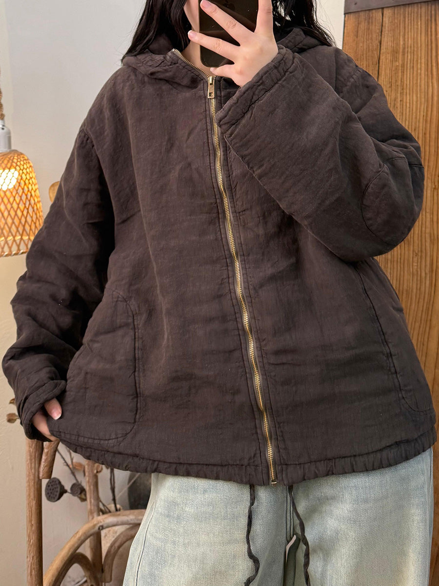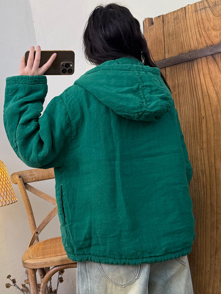 Women Autumn Retro Pure Color Linen Hooded Coat