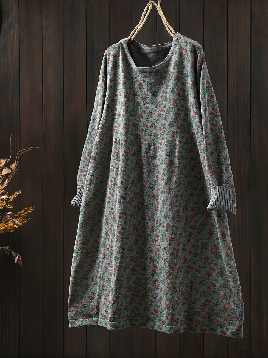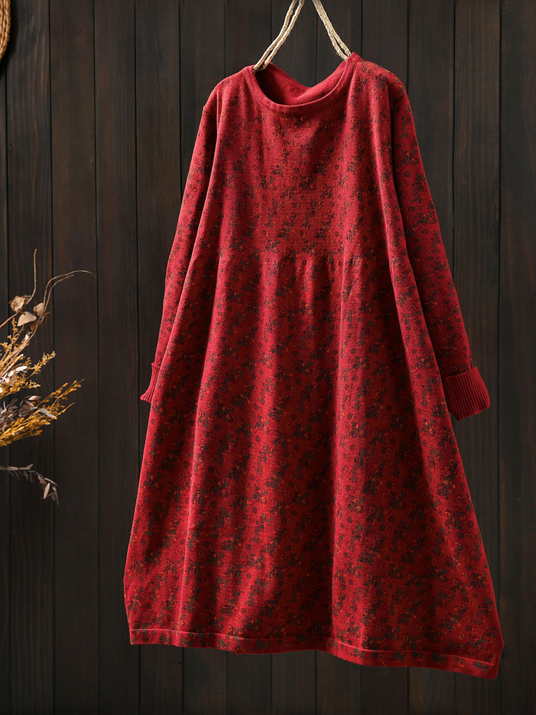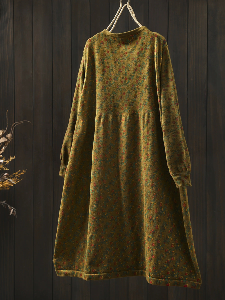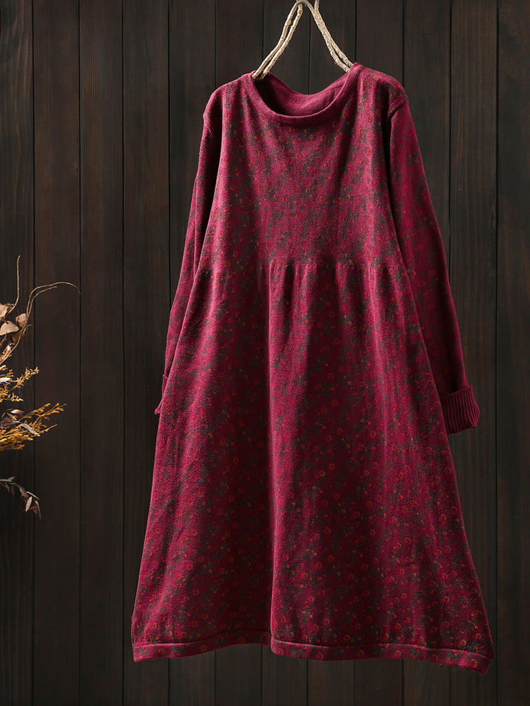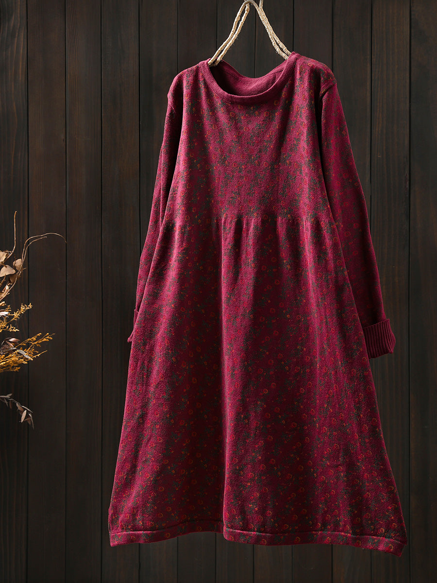 Women Autumn Vintage Floral O-Neck Knitted Dress