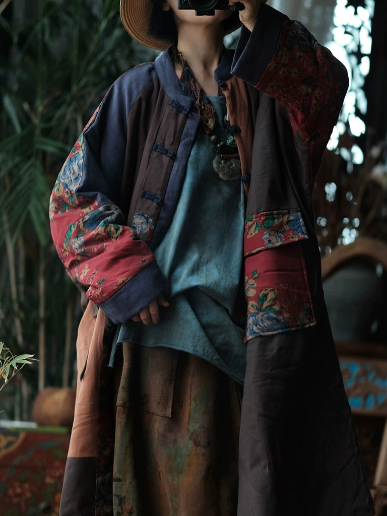 Women Autumn Vintage Patchwork Stand Collar Padded Coat