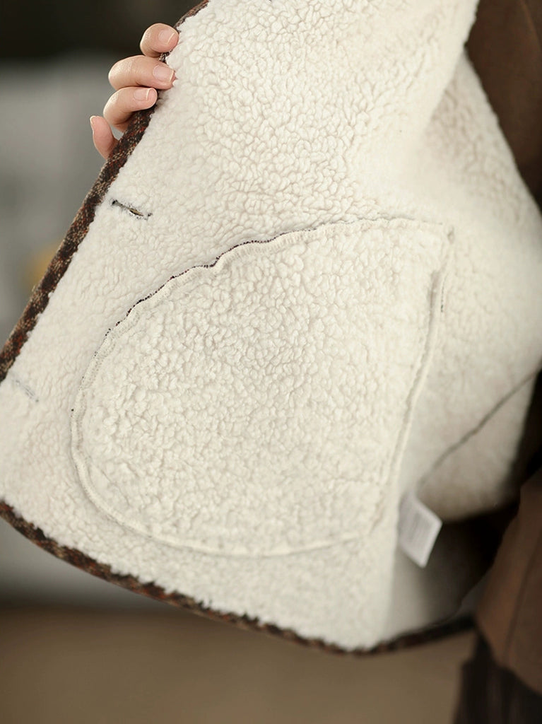 Women Autumn Vintage Plaid Fleece-lined V-Neck Coat