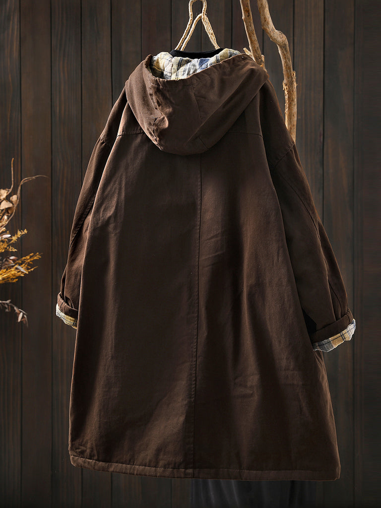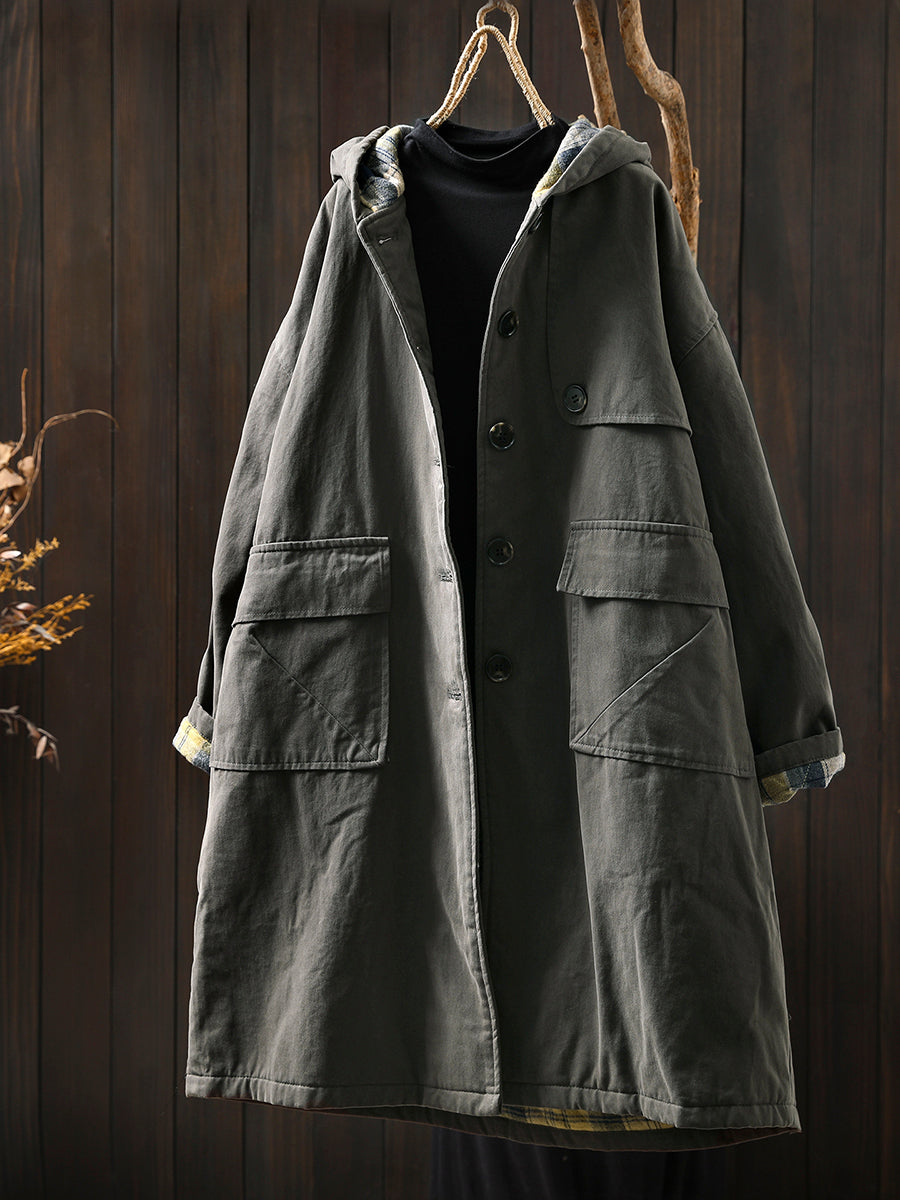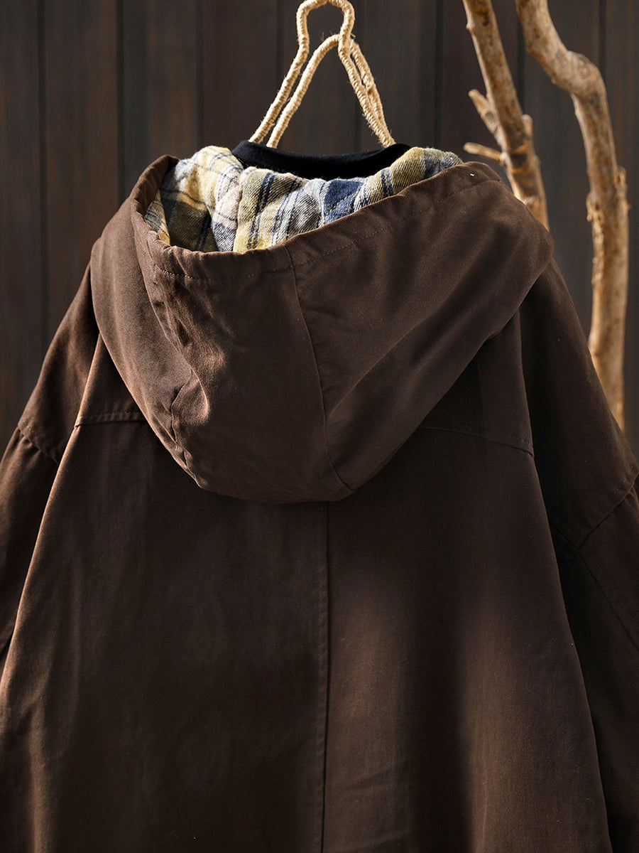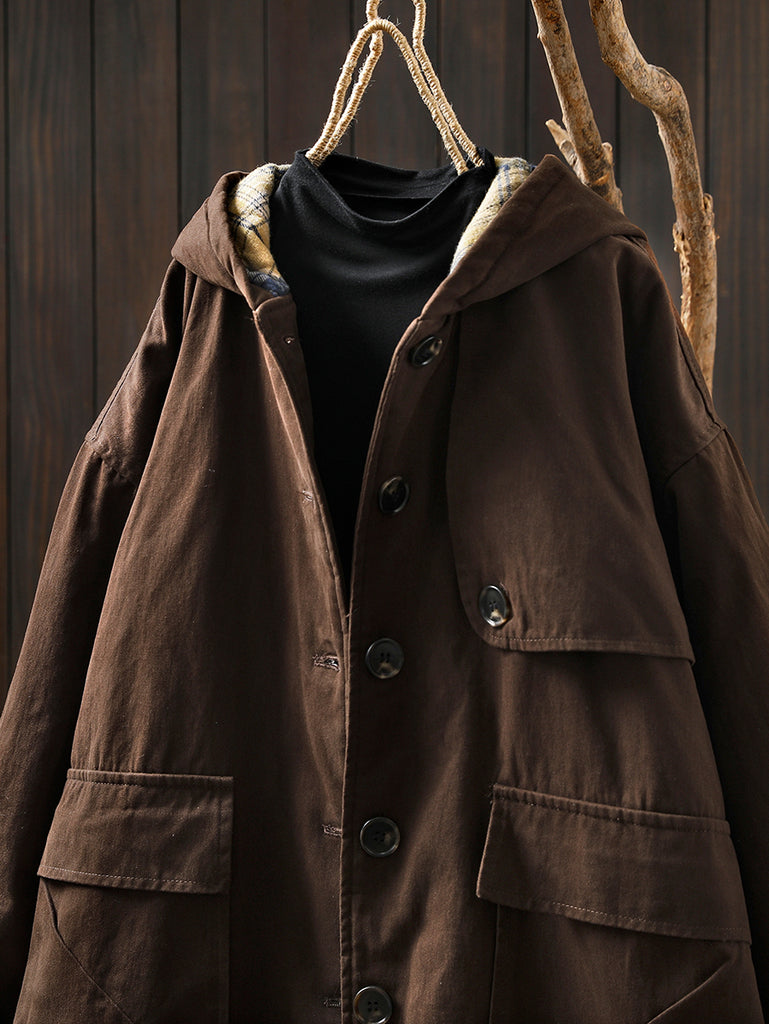 Women Autumn Vintage Pure Color Cotton Hooded Coat