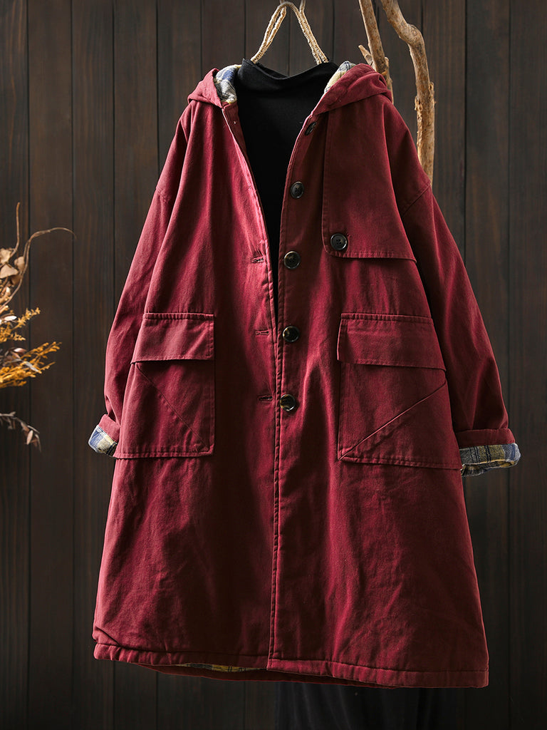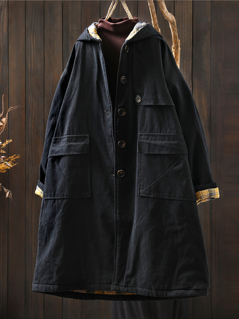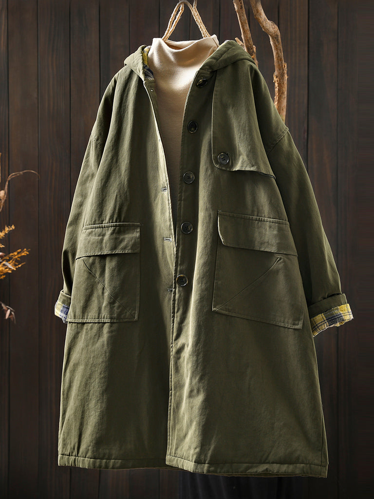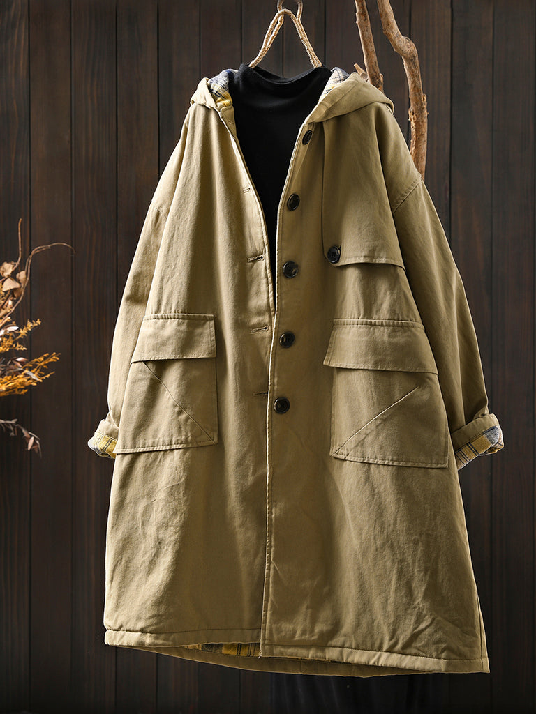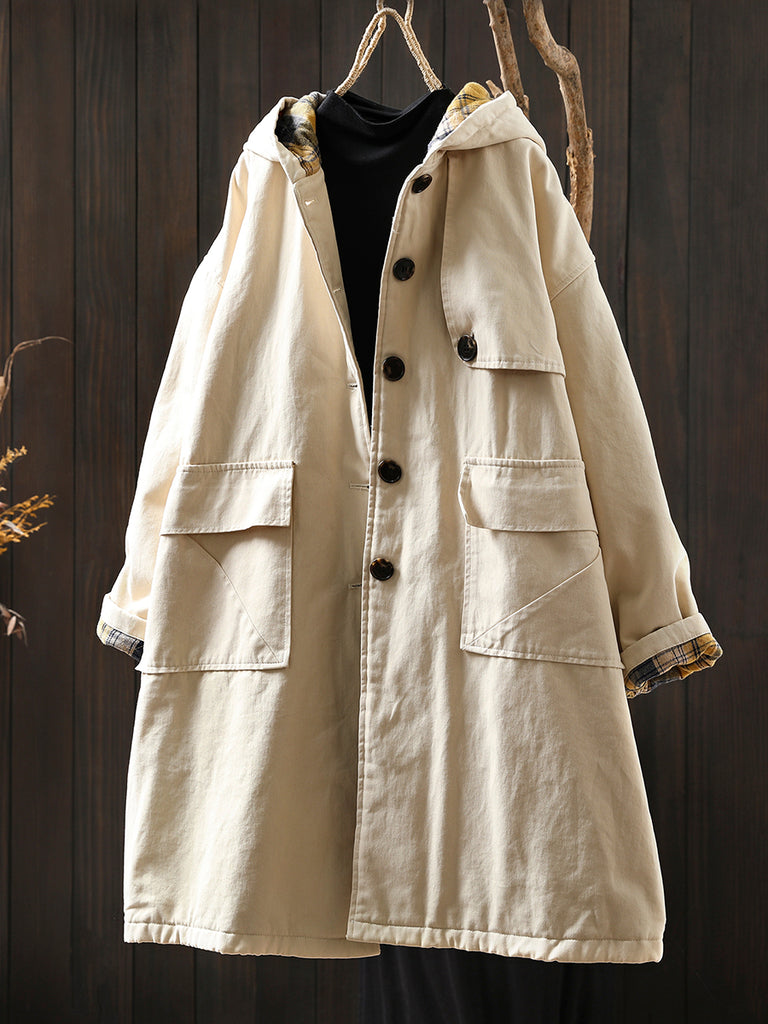 Women Autumn Vintage Pure Color Cotton Hooded Coat